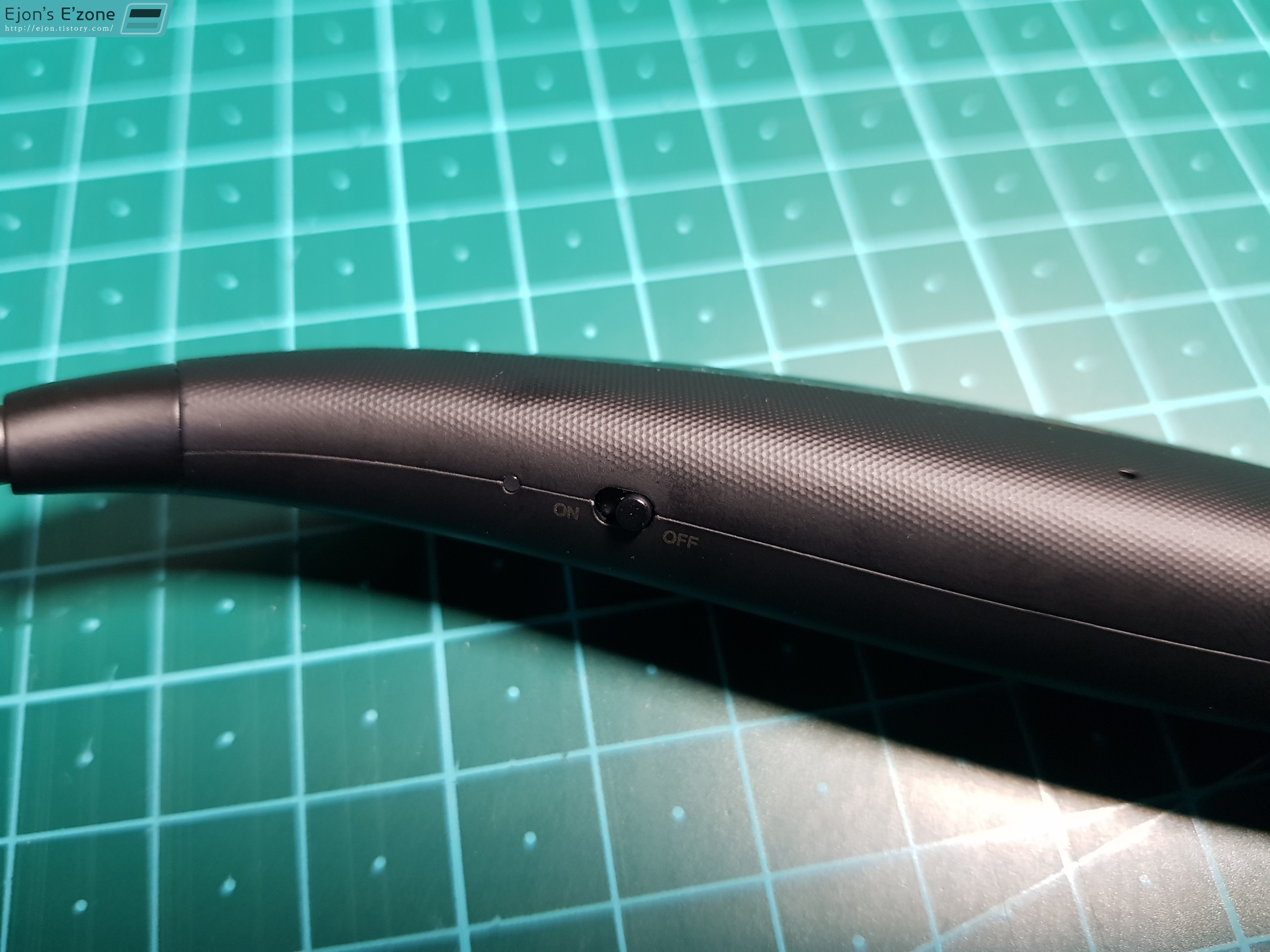 기기 좌측에 모든 버튼, 마이크가 위치한 모습입니다. 기기 좌측 목에 닿는 부분에 전원 버튼과 LED가 위치해 있습니다.