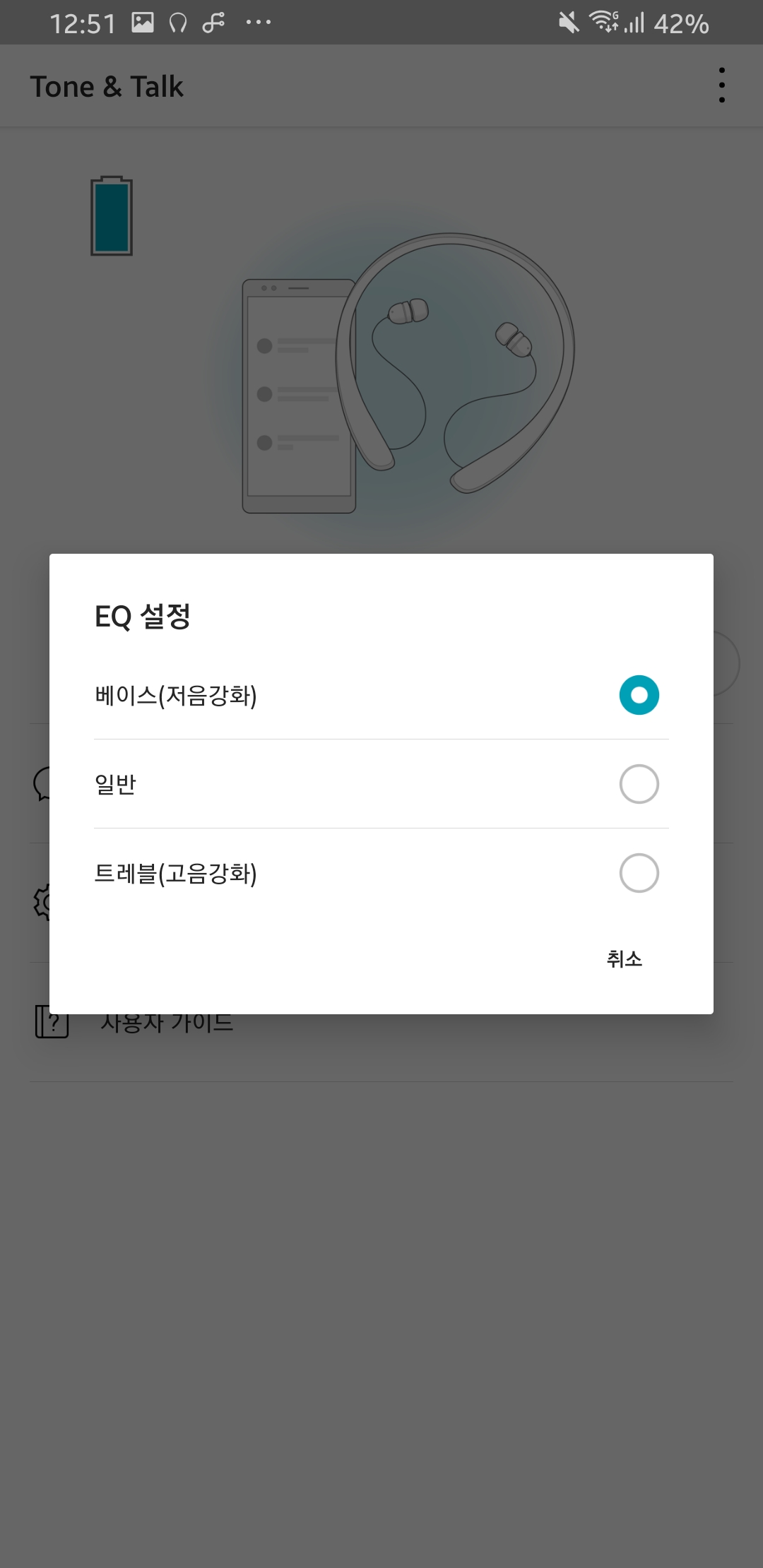 LG Tone & Talk 앱을 이용하면 알림을 설정하여, 메시지나 전화가 왔을 때 대략의 정보를 음성으로 안내받을 수 있습니다. 그리고 EQ도 여기서 설정할 수 있습니다만, EQ별 큰 차이는 없습니다. 차후에도 언급하겠지만, 전체적인 고음 위주의 소리는 변하지 않습니다. 앱의 좋은 점은, 안드로이드 휴대폰과 연결했을 때 연결 즉시 이 앱의 설치를 추천한다는 것입니다. 일부러 앱을 찾으러 구글플레이를 방문할 필요가 없다는 점은 편리했습니다.
