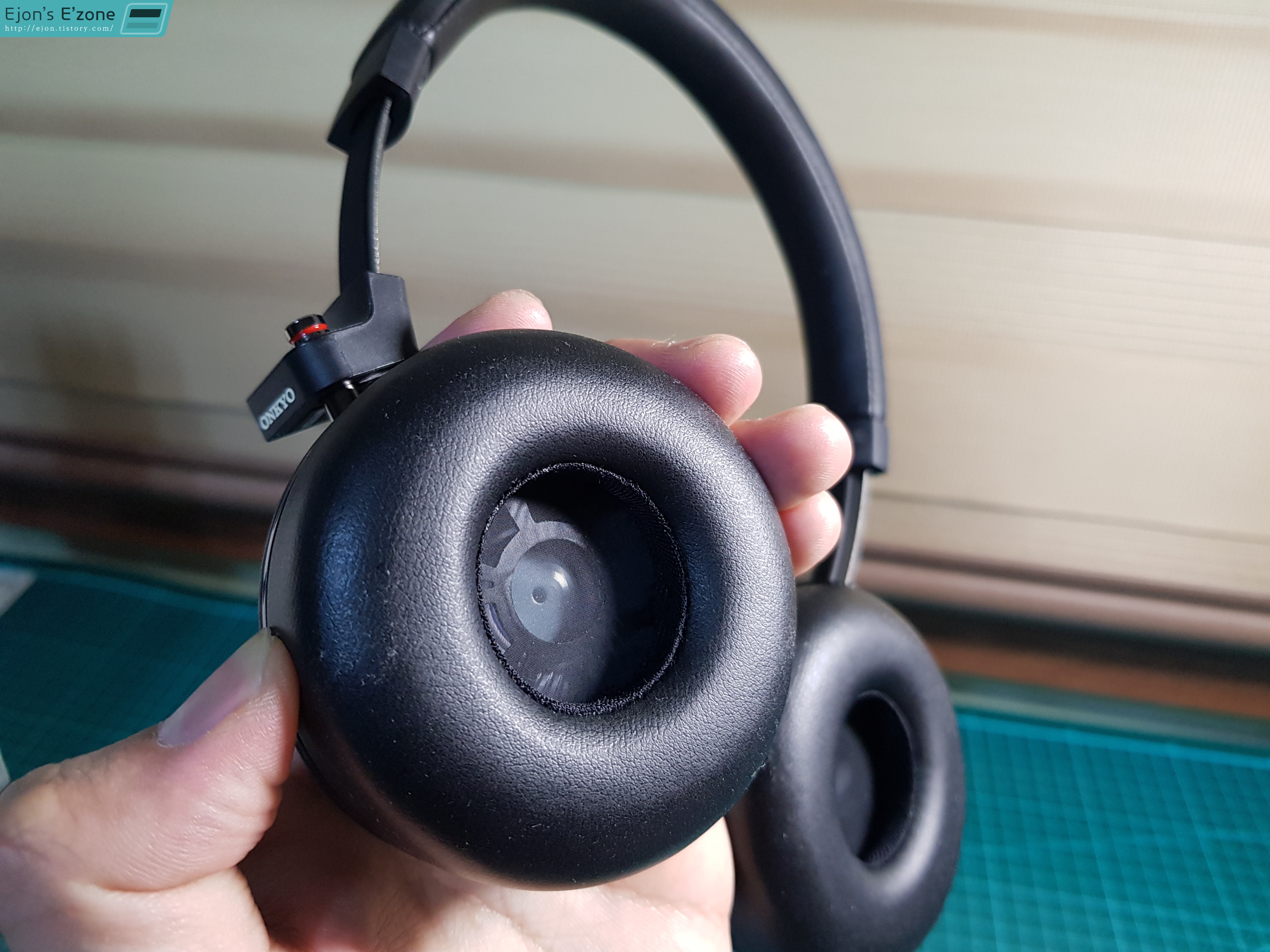 헤드폰 드라이버에는 먼지가 들어가지 않도록 망이 있는데, 상당히 투명해서 40mm 드라이버가 잘 보입니다. 그리고 왼쪽에 마련된 3.5파이 이어폰 단자를 통해 AUX케이블을 사용하면 블루투스 이어폰이지만 유선으로도 사용할 수 있습니다.