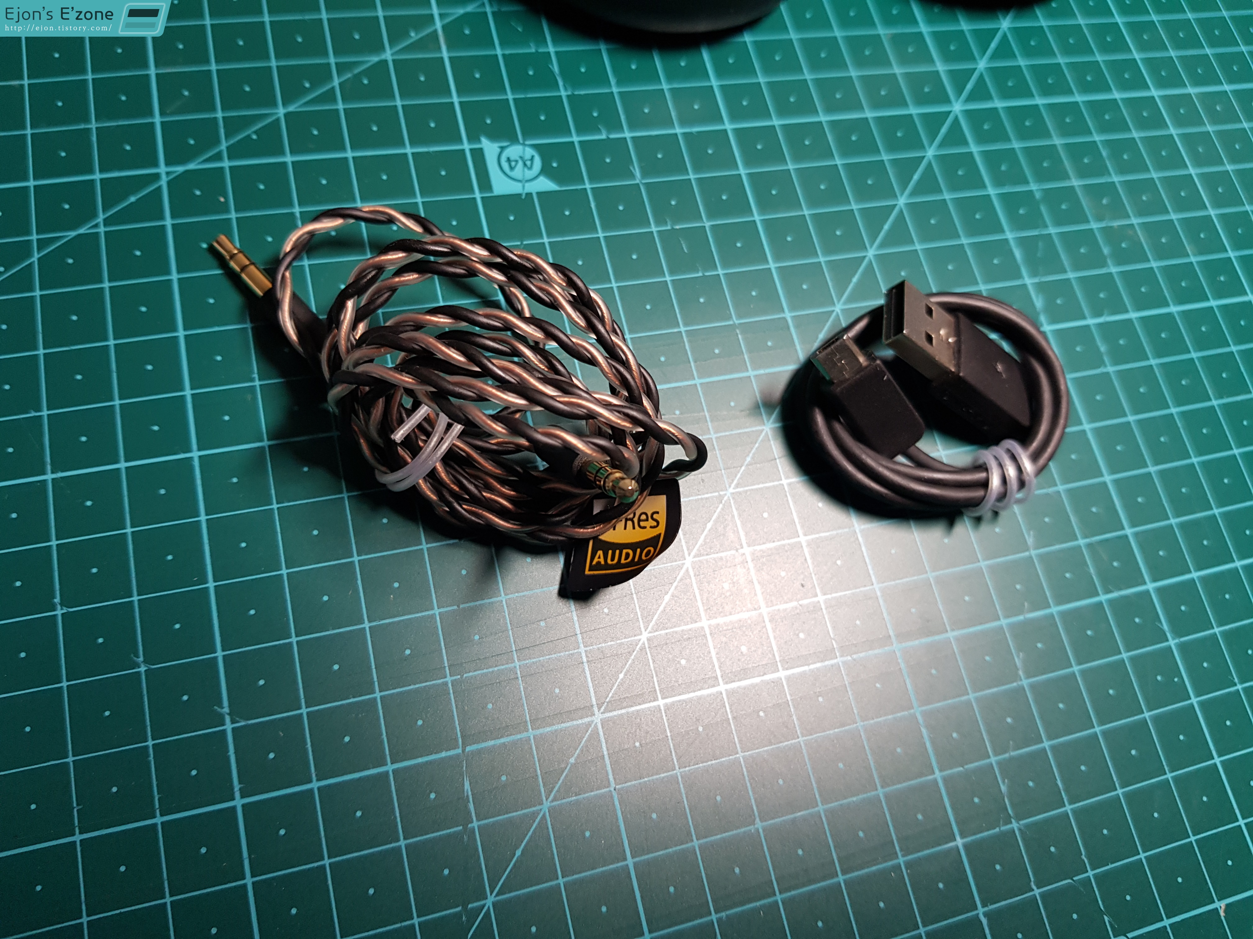 기기를 꺼내기 위해 포장을 더 열어보니, AUX 케이블과 충전케이블이 보입니다.