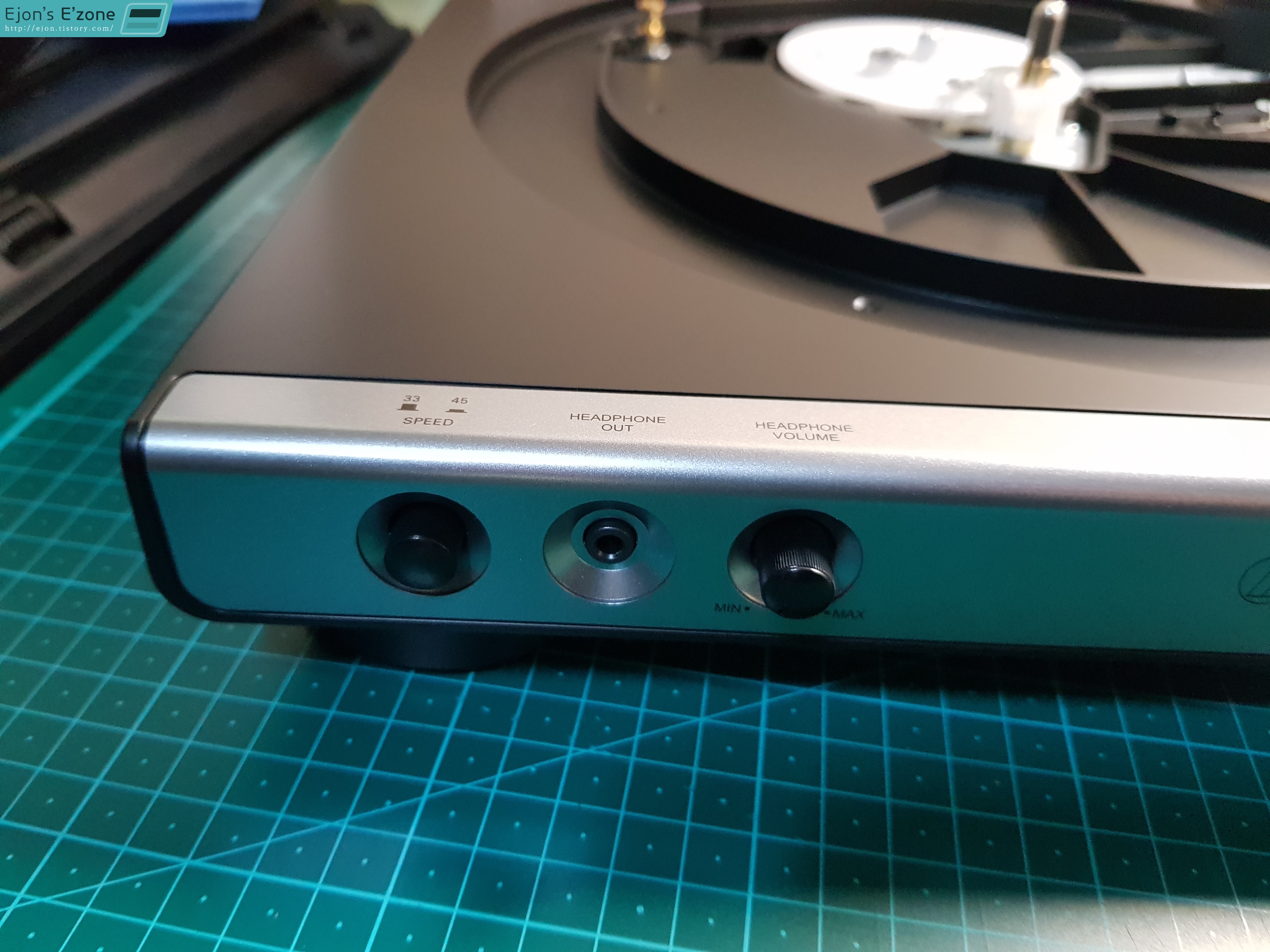 제품 전면 좌측에 있는 버튼은 왼쪽부터 순서대로 원반 회전 속도 버튼, 헤드폰 단자, 헤드폰 볼륨 조절 버튼입니다. 원반 회전 버튼은 누르지 않은 상태(튀어나와있는 상태)가 33RPM, 누른 상태가 45RPM입니다. 헤드폰 단자와 볼륨조절 버튼은 AT-LP60XHP에만 달려있는 것으로, 전면에서도 헤드폰이나 이어폰을 쉽게 연결할 수 있습니다.