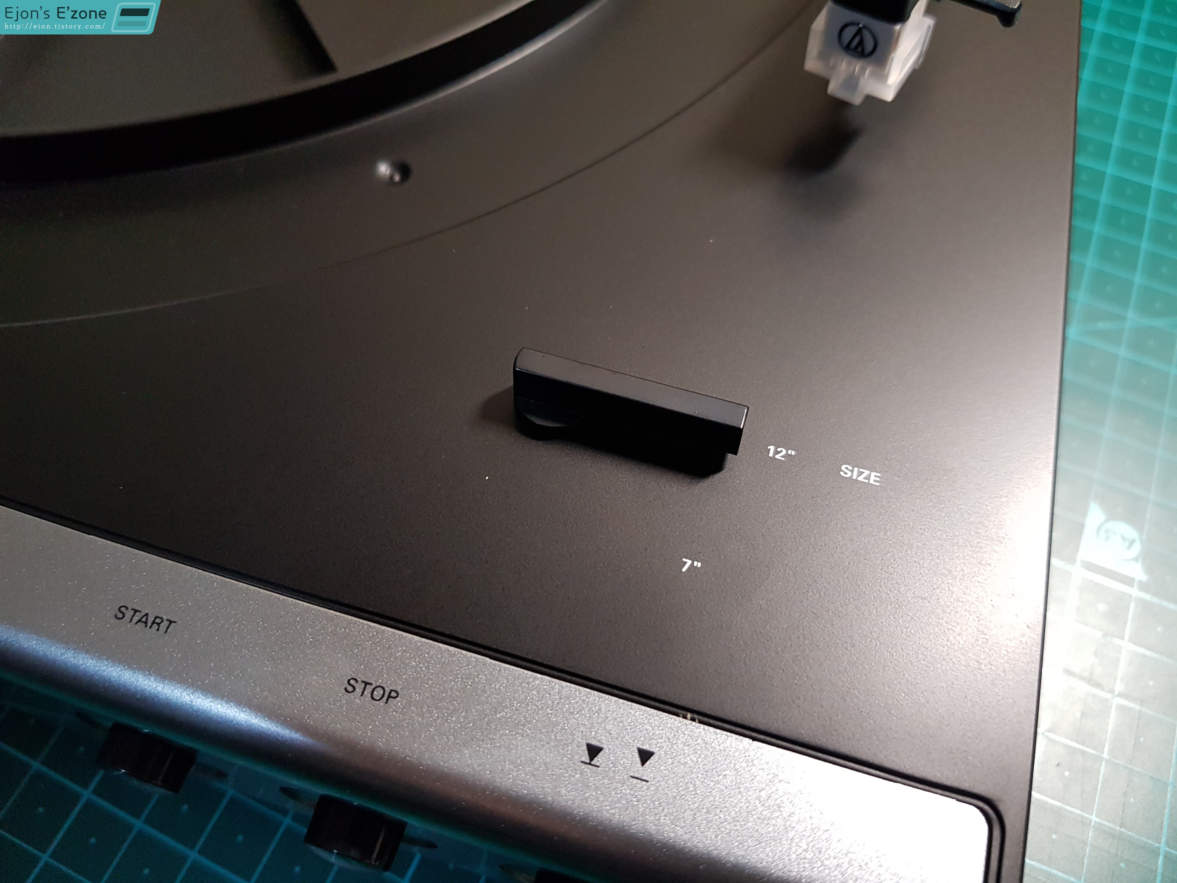 조립하기 전에, 먼저 조작법을 살펴봅시다. 대부분의 버튼은 전면에 위치하는데, 유일하게 LP 사이즈 조절 레버는 제품 상단에 위치하고 있습니다. 12인치와 7인치를 선택할 수 있어요. 보통 우리에게 익숙한 LP판은 12인치입니다. 좀 작은 것 같은 LP판이 7인치예요.(물론 작다고 해도 상대적으로 작은 거지, 우리가 익히 아는 CD보다 훨씬 큽니다.)