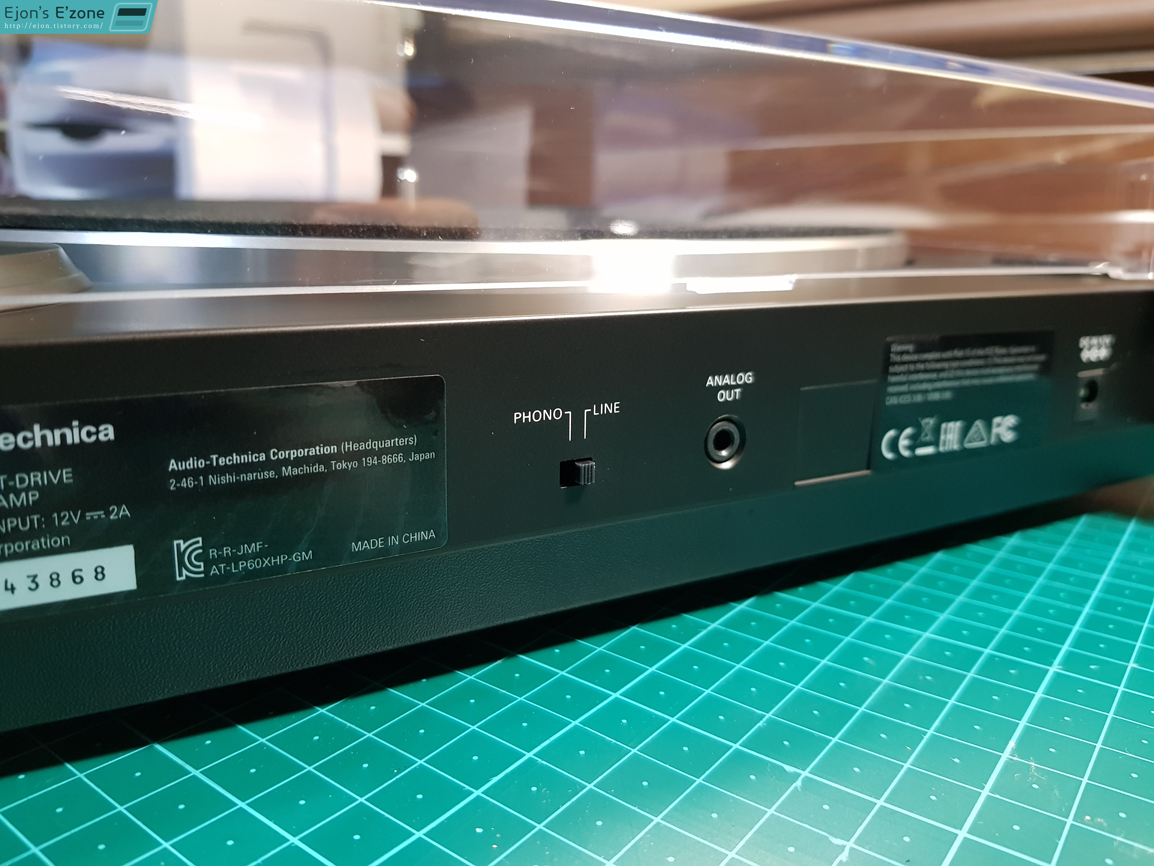 제품 뒷면에는 프리앰프를 선택할 수 있는 버튼과 아날로그 출력 단자(3.5파이), 그리고 전원 어댑터 단자가 있습니다. AT-LP60XHP모델을 제외한 모델에는 아날로그 출력 단자가 뒤에 하나씩만 존재합니다.
