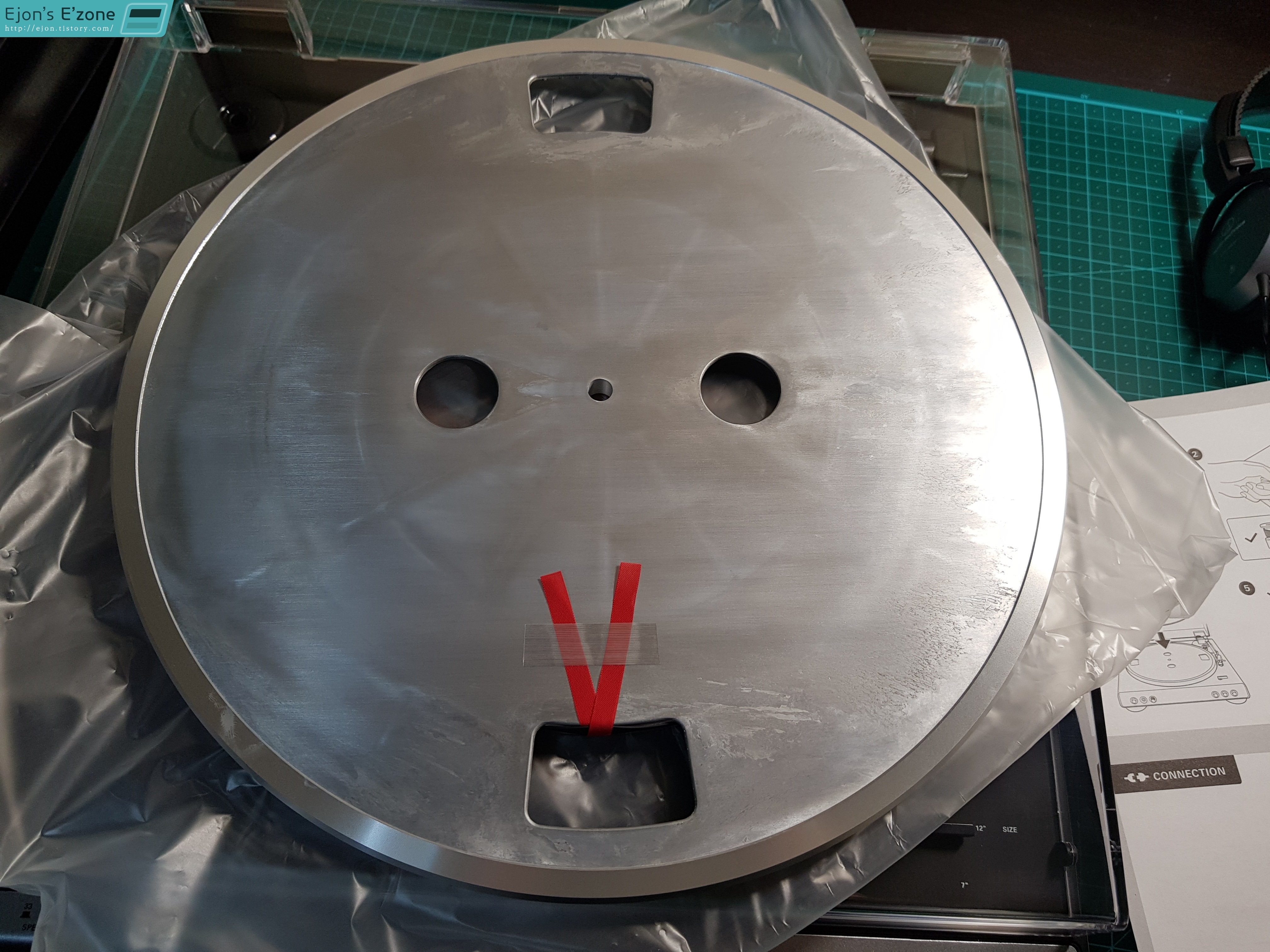 이외에 턴테이블을 돌리는 원반 플래터가 있습니다. 원래 이게 조립되어서 오는 게 아닌가봐요. 직접 기기에 넣어줘야 합니다.