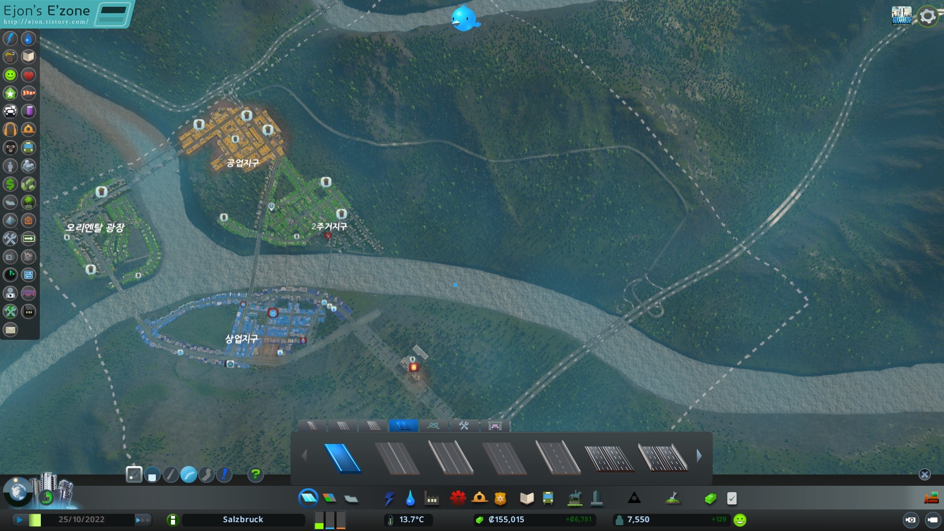 저는 이런 식으로 나눴습니다. 주거지역과 상업지역을 굳이 나누지 않아도 되지만, 나눈 이유는 대부분의 '시티즈 스카이라인'의 대중교통 수요는 대부분 상업지구에서 나오기 때문입니다. 대중교통을 운영할 때, 주거지역과 상업지구를 이어주는 노선을 만들어 둠으로써 상업지구로 이동할 때 대중교통을 타도록 유도해 대중교통 수요를 높이려 하는 의도에서지요.