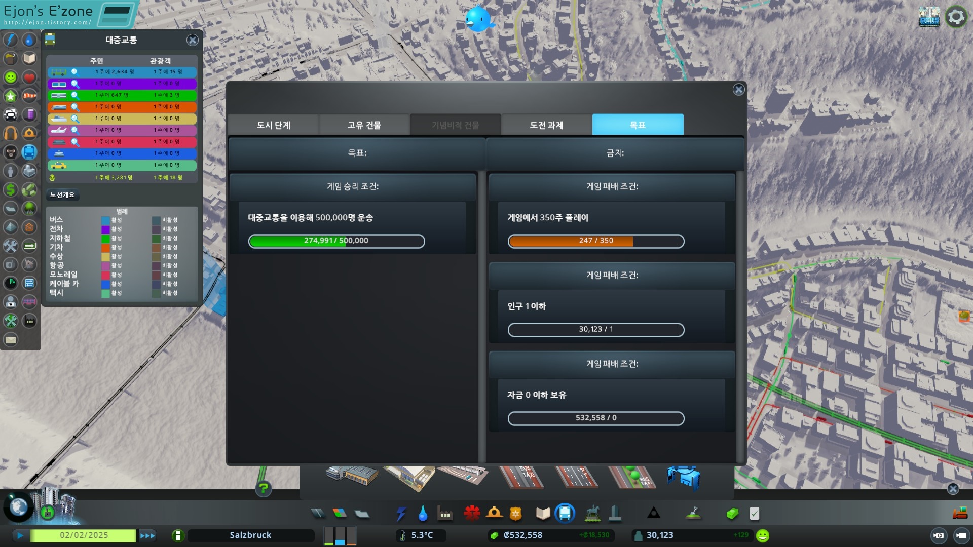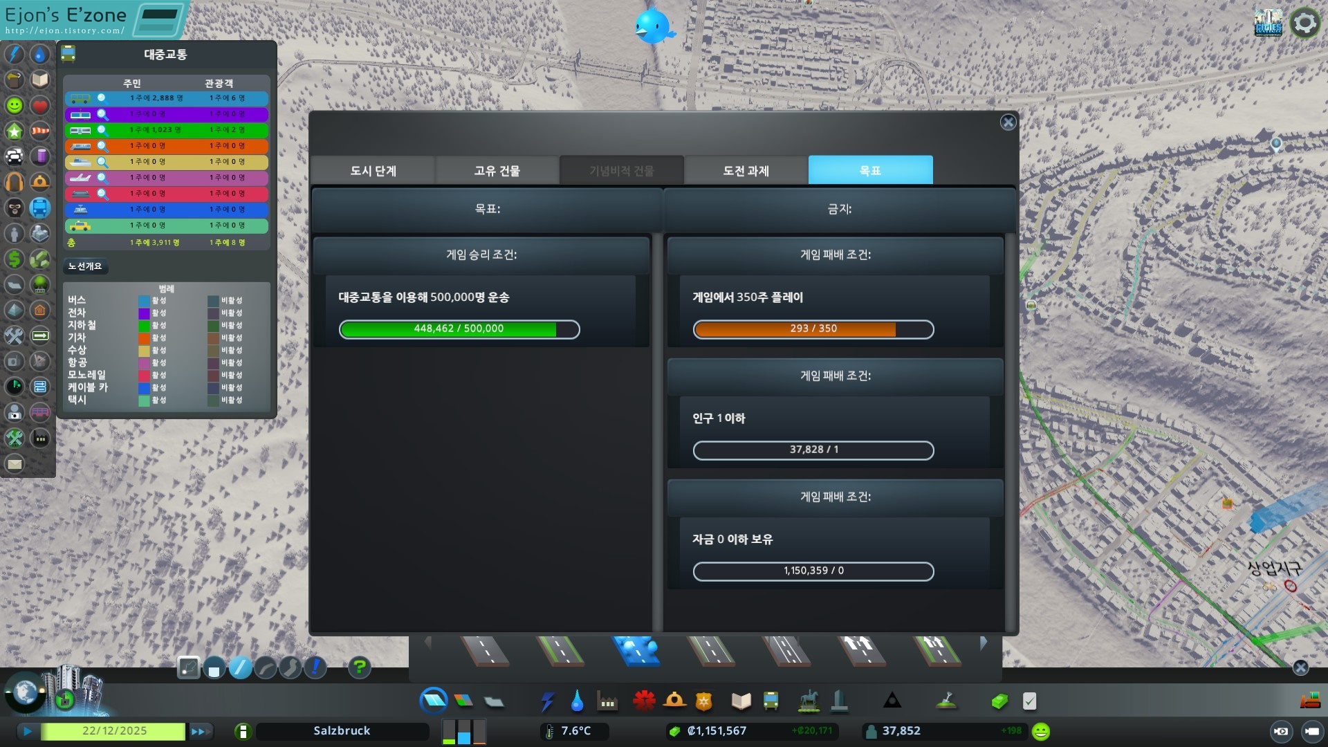 사실 이 시나리오는 그닥 어렵지 않습니다. 이론적으로는 주당 1428명 이상(50만/350주) 을 대중교통으로 운송하면 되기 때문이예요. 그러나 실제로 대중교통을 게임 시작과 동시에 사용할 수 있는 것이 아니기 때문에, 넉넉잡아 50주동안 대중교통을 사용할 수 있는 정도로 도시를 성장시킨 후, 남은 300주동안 대중교통 이용자 수가 주당 1666명 이상을 유지하기만 하면 되는 것이죠.