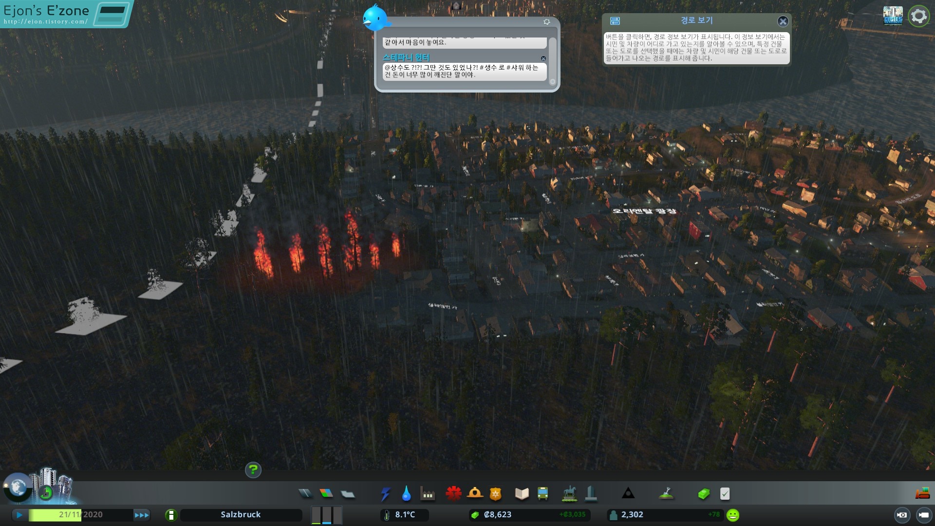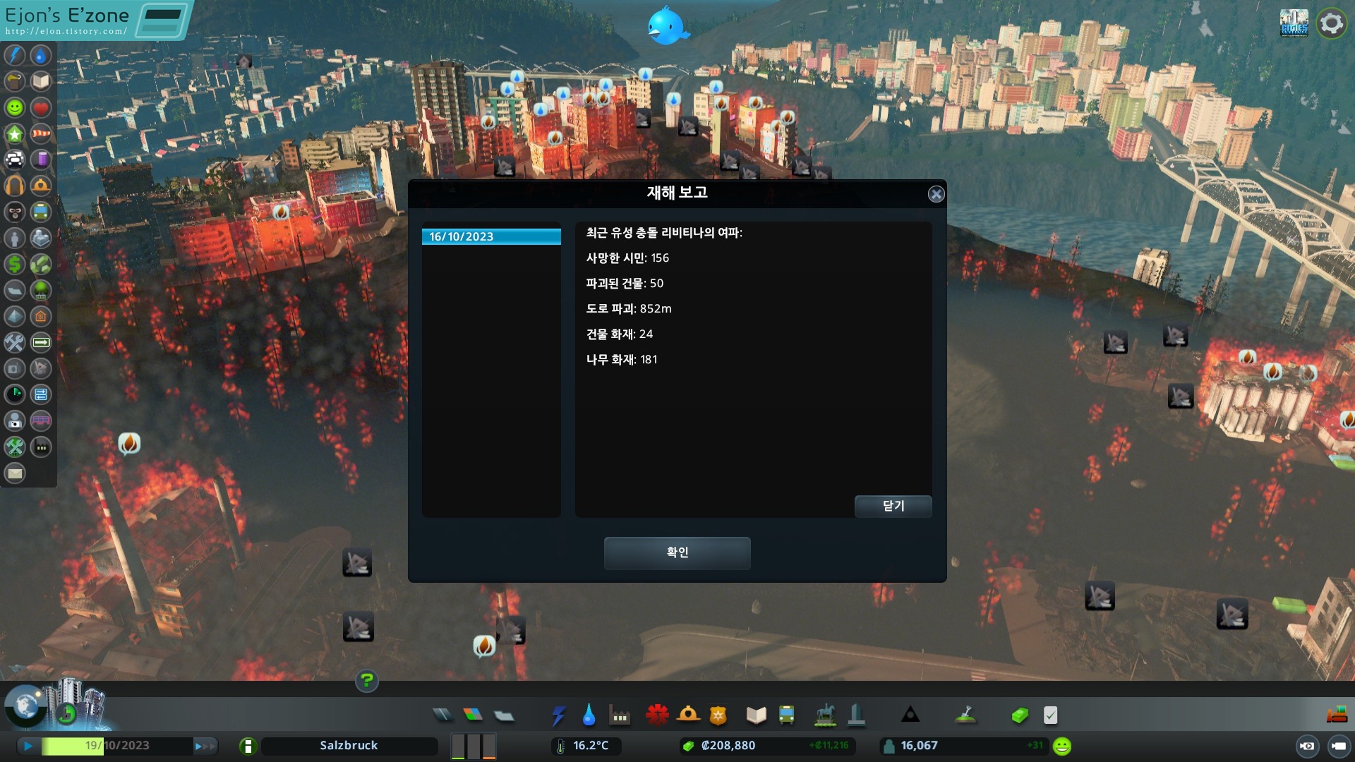 참고로 자연재해 DLC의 시나리오라서 그런지, 가끔 여러 자연재해가 발생합니다. 이처럼 화재가 발생하기도 하고