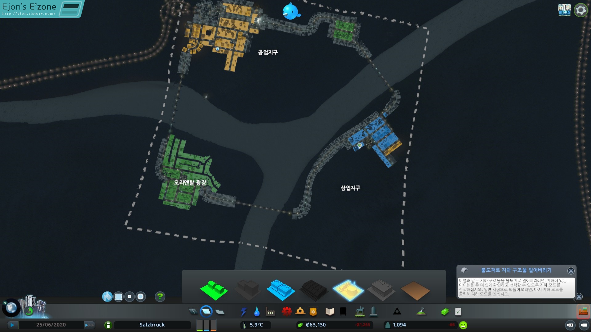 앞에서 살짝 언급했지만, 이 맵은 평지가 거의 없습니다. 그래서 도로를 깔기도 쉽지 않고, 도로를 깔아도 보시는 것처럼 건물을 지을 수 있는 구역이 상당히 좁습니다.