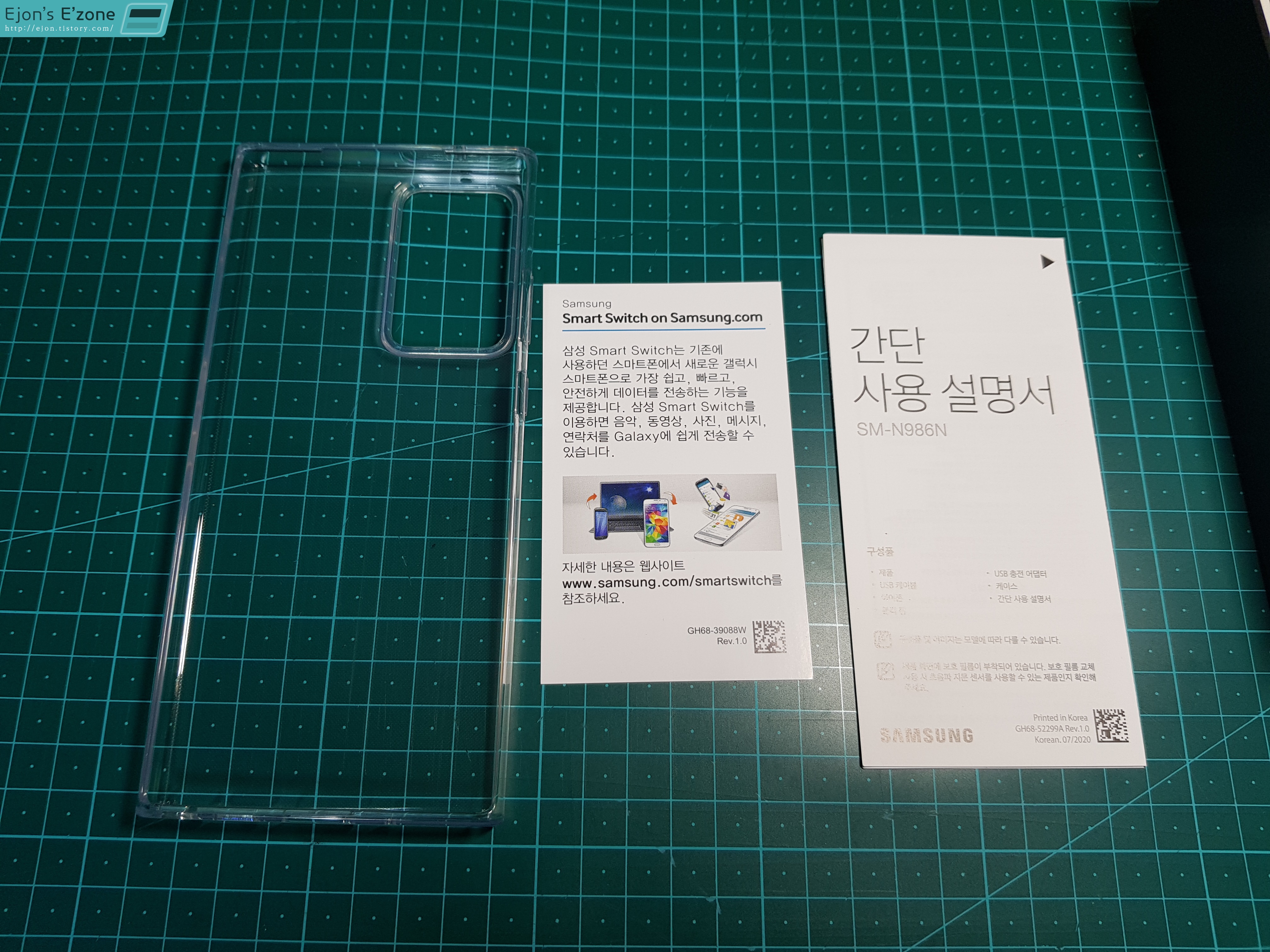 박스에 숨어있는 뚜껑에는 유심(USIM)칩과 마이크로 SD카드를 끼울 수 있도록 해 주는 이젝터(유심핀)와 함께, 박스 안에는 투명 젤리케이스와 간단 사용설명서, 그리고 삼성 스마트 스위치를 소개하는 종이가 있습니다. 그중에서도 가장 중요한건 케이스겠죠. 사전예약이라 딱히 케이스 구할 데가 없어서, 이런 케이스는 소중합니다.