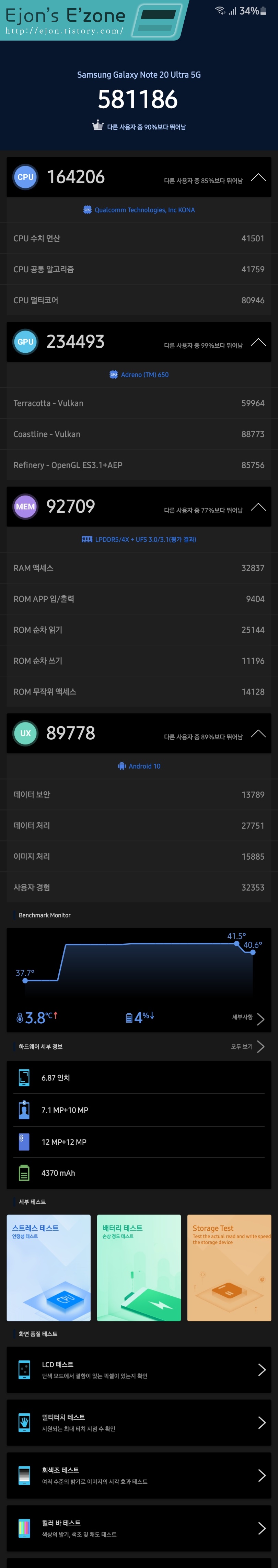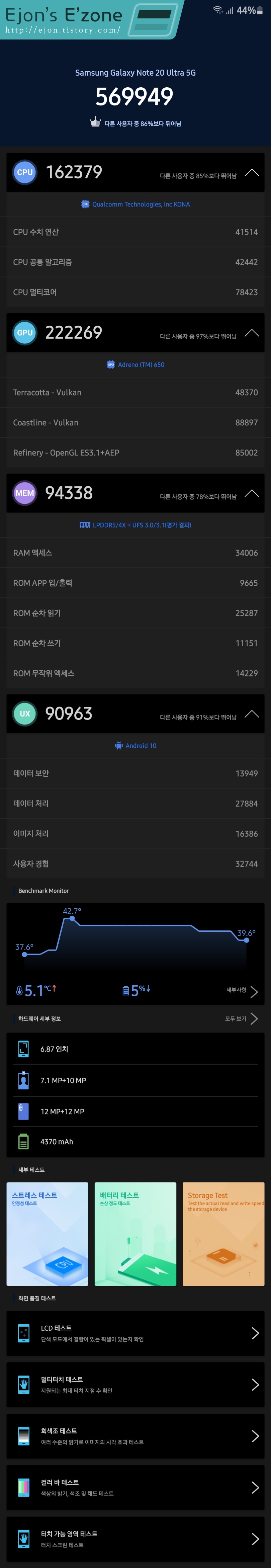 노트 20 울트라의 성능이 얼마나 좋은지는 벤치마크 프로그램을 돌려서 확인해 보겠습니다. Antutu 벤치마크와 긱벤치를 여러번 돌려볼게요.