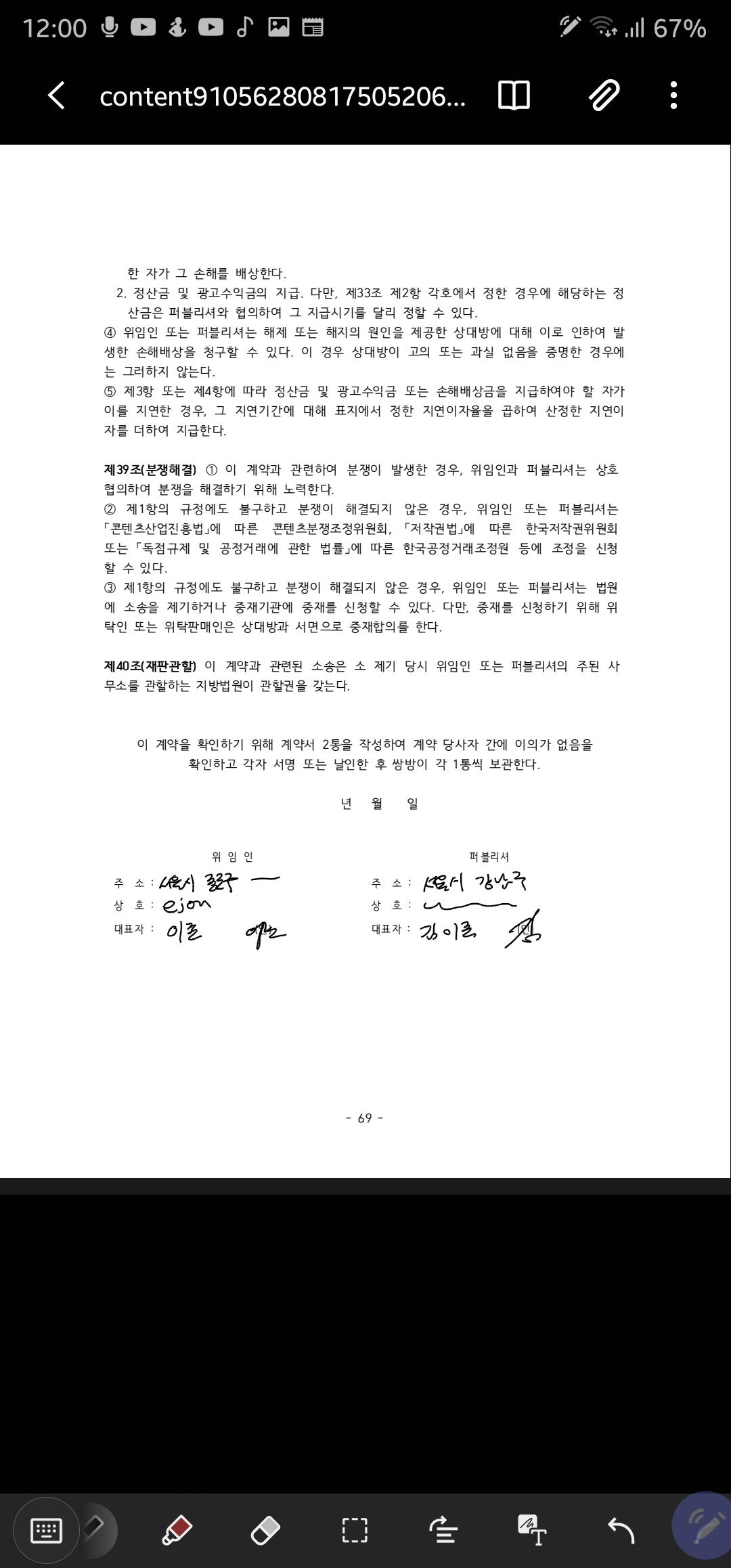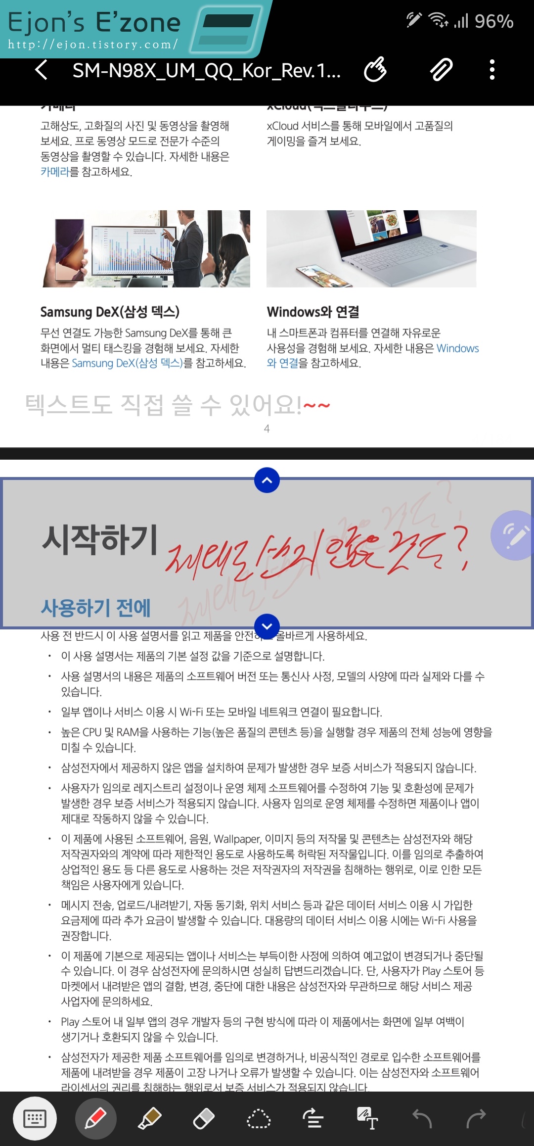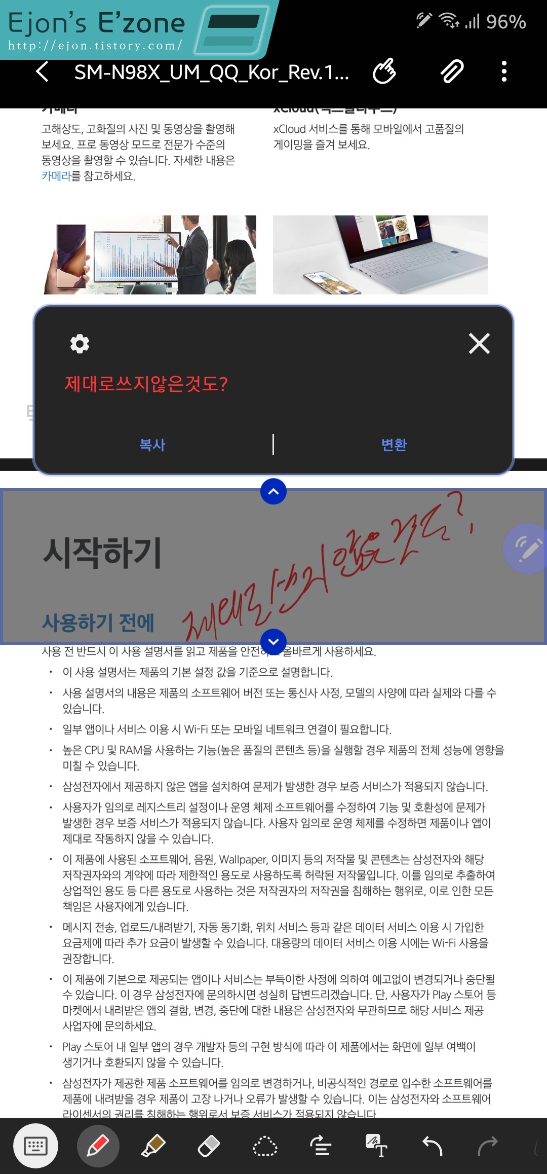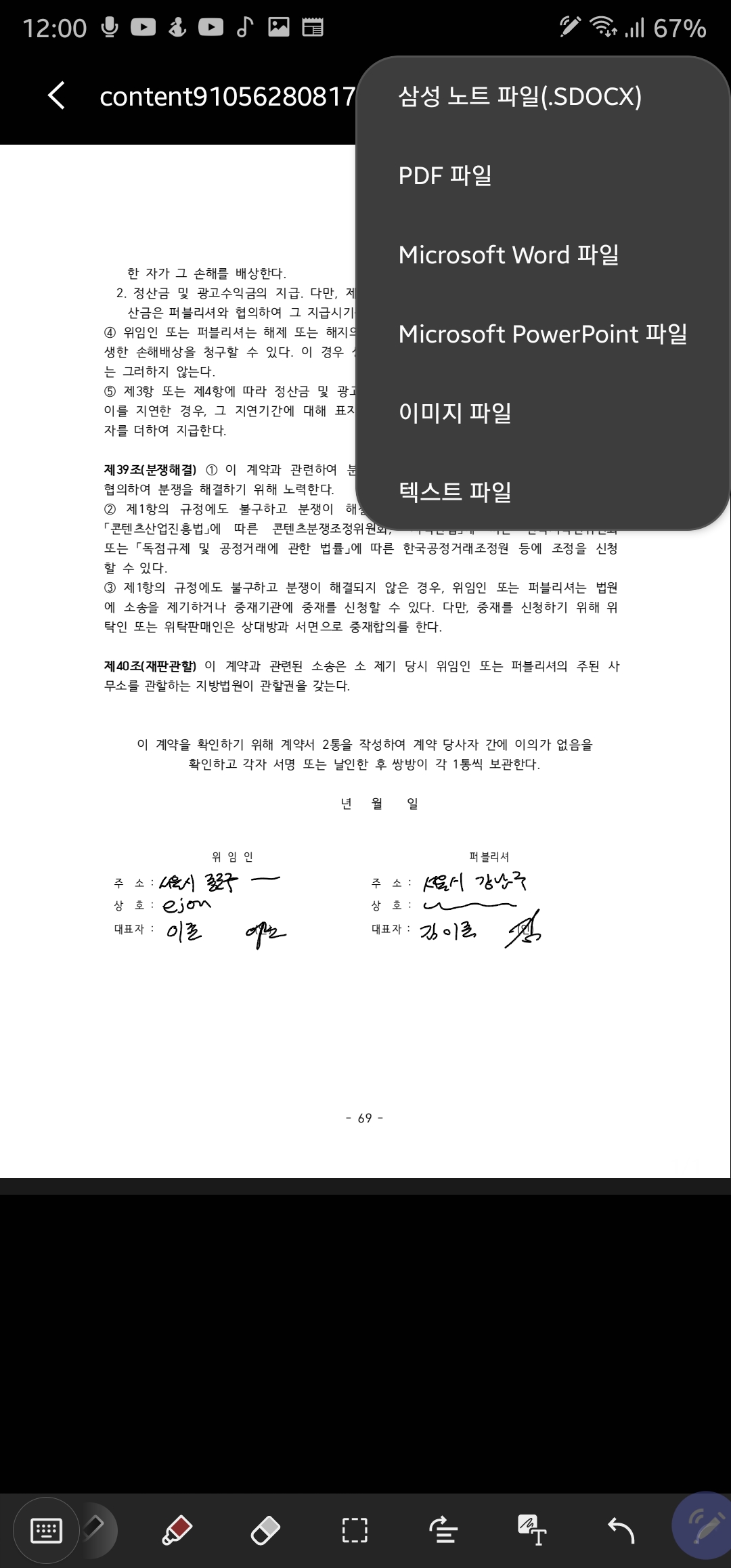 한글 파일이나 PDF 파일로 된 계약서나, 사인을 해야 할 문서 파일도, 직접 인쇄해서 사인할 필요 없이 노트를 이용해 사인이나 내용을 작성하고 보내는 방식으로도 응용이 가능합니다. 만약 한글 파일이라면, 한글 앱을 이용해서 PDF로 인쇄하신 후에 삼성노트로 불러오시거나, 스마트 셀렉트로 그 부분만 스크린샷을 찍은 후 직접 펜으로 필요한 부분을 작성하실 수 있어요.