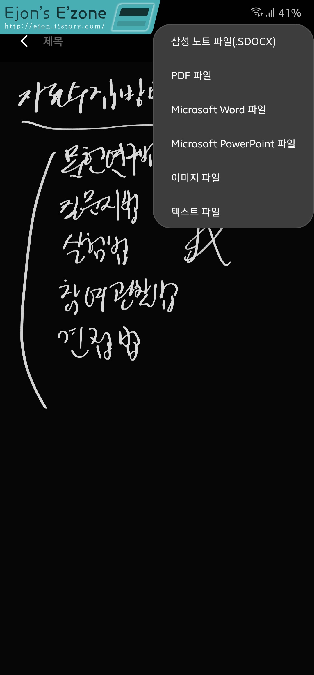 파일로 저장하는 옵션도 다양해졌습니다. 삼성 노트 파일뿐만 아니라, PDF파일, 마이크로소프트 워드 파일, 파워포인트 바일, 이미지 파일, 텍스트 파일로 내보낼 수 있습니다. 그래서 우측에 테스트 파일을 각각 ppt와 워드 파일로 내보내 볼게요.