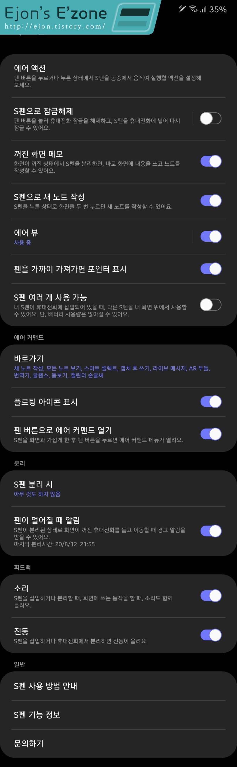 S펜 분리 시 어떤 동작을 하게 할지도 정할 수 있습니다. S펜을 분리했을 때, 에어 커맨드를 열게 할 수도 있고, 새 노트를 작성하도록 할 수도 있고, 아무것도 하지 않을 수도 있습니다. 저는 아무것도 하지 않도록 해 두었습니다.