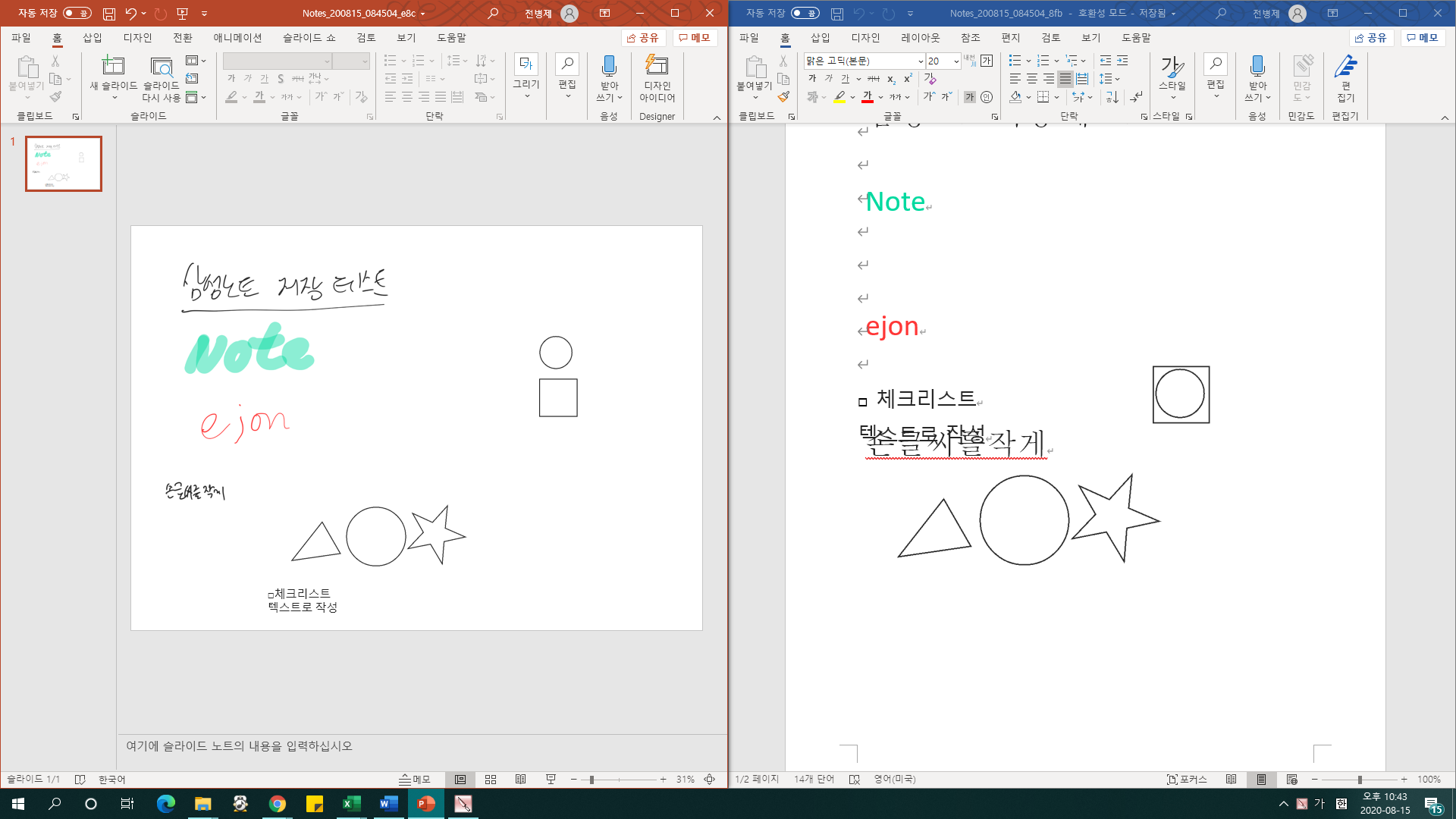워드는 내보낼 때 옵션을 선택할 수 있습니다. 글자를 텍스트로 변환해서 내보내거나, 글자를 손글씨 그대로 내보내는 옵션이지요. 만들어진 도형은 각각 하나씩 개체로 자유롭게 이동할 수 있게끔 변환됩니다. 대신 손글씨를 텍스트로 변환하면서 워드 파일에는 텍스트 위치가 조금 꼬인 것 같습니다.