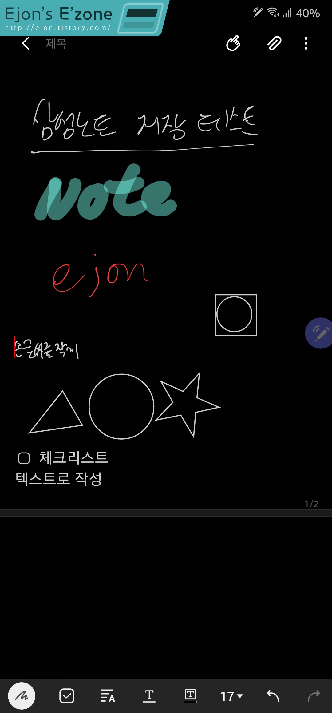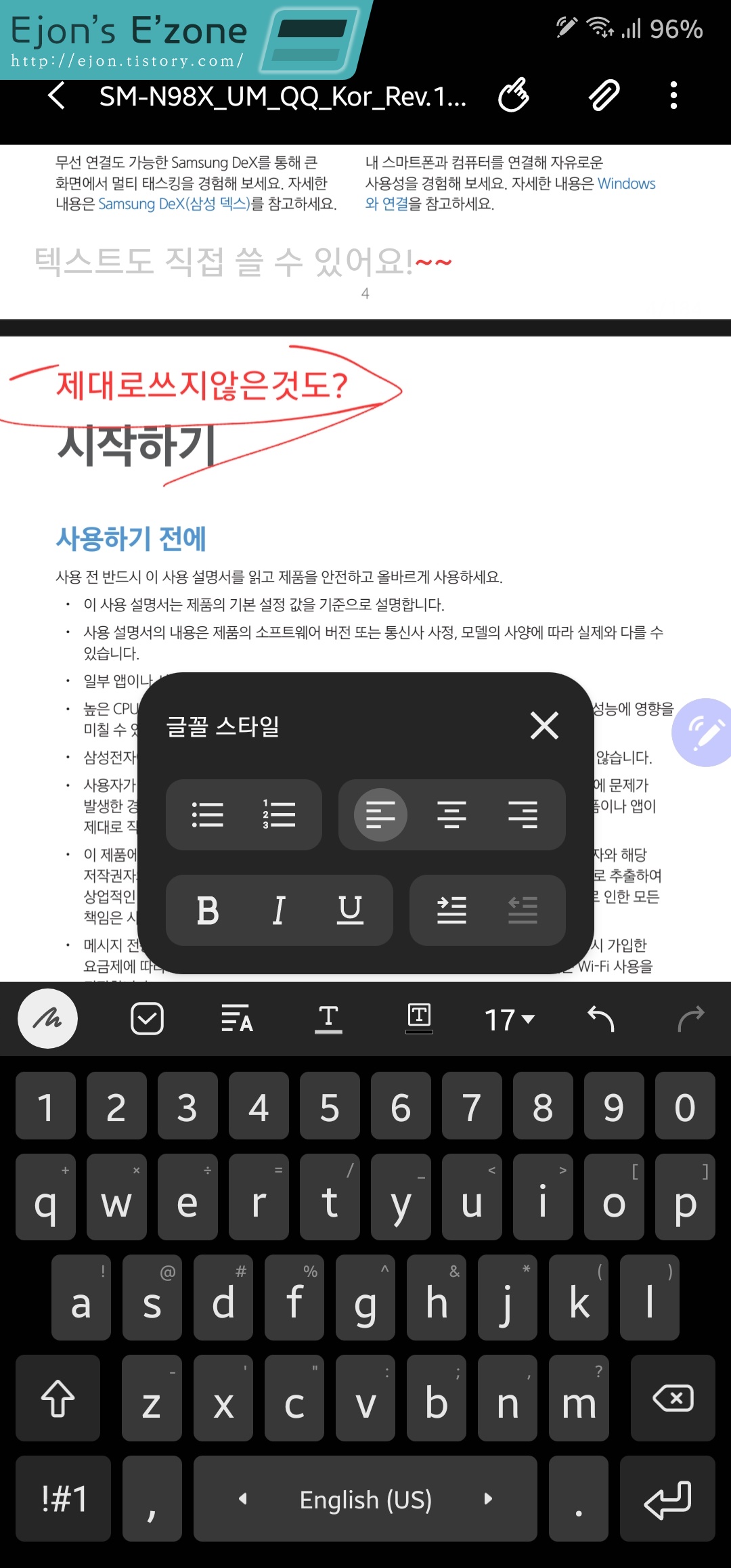 PDF를 불러오는 데 오랜 시간도 걸리지 않고, 삼성 노트의 기능을 제한없이 사용할 수 있습니다. 필기 당연히 가능하고, 텍스트도 직접 쓸 수 있습니다. 단, 텍스트의 위치를 자유롭게 지정할 수는 없습니다. 꼭 왼쪽으로 커서가 박히더라구요. S펜이 지원하는 수평맞춤, 텍스트변환, 도형도 쓸 수 있습니다.