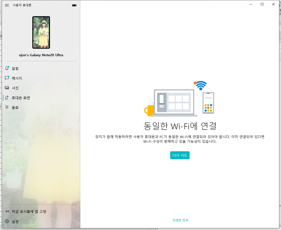 데스크탑에 연결한 모습입니다. 보세요. 달랑 두 가지밖에 쓸 수 없습니다!! 이건 뭐 활용을 할 수가 없어요. 휴대폰의 사진과 메시지만 확인할 수 있어요. 사용할 수 있는 기능이 너무나도 적습니다. 그마저도 사진은 확대해서 볼 수도 없고, 새로고치는데 엄청 시간이 많이 걸려서 사실상 활용하기가 어렵습니다. 차라리 덱스를 쓰는 게 훨씬 나아 보여요.