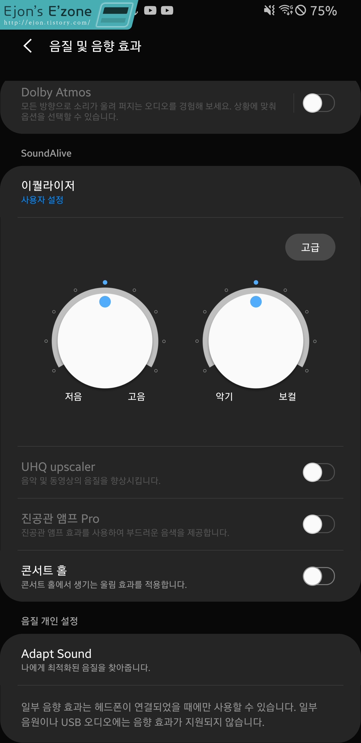 음질 및 음향 효과에서는 딱히 선택권이 많지 않습니다. 돌비 애트모스가 들어간 것은 좋지만, 이전부터 삼성 음장의 상징이던 사운드얼라이브는 이제 그 이름마저 볼 수 없게 되었습니다. 예전에 삼성 mp3에만 들어가 있던 음장 기능이 사운드얼라이브(당시에는 DNSe 였지요.)였어요. 다른 것은 몰라도 DNSe의 콘서트홀 음장은 정말 좋았었는데 아쉬운 부분입니다. 물론 지금도 콘서트홀 음장을 사용할 수는 있지만, 예전에 비해 옵션의 자유도가 현격히 줄어들었어요. 예전에는 콘서트홀 사이즈나 레벨 같은 것도 다 설정할 수 있었는데... 아쉽습니다.