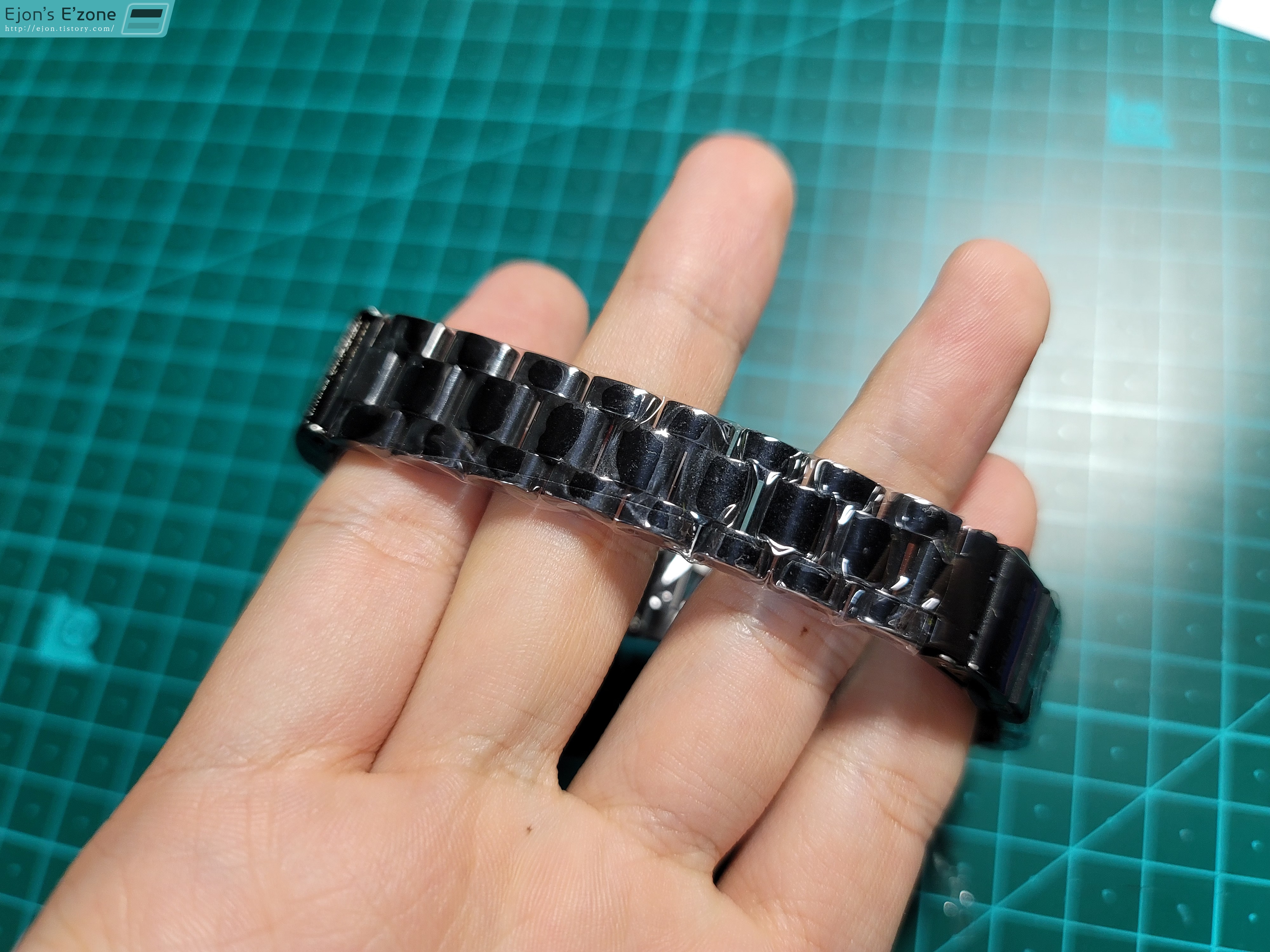 메탈 스트랩은 오면서 기스가 나지 않도록 비닐로 포장되어 왔네요. 이 부분은 마음에 듭니다. 물론 저 비닐을 제거하는 게 제법 귀찮긴 했지만요. 스트랩을 풀 때는 연결부의 양 쪽 버튼을 동시에 눌러 풀 수 있습니다.