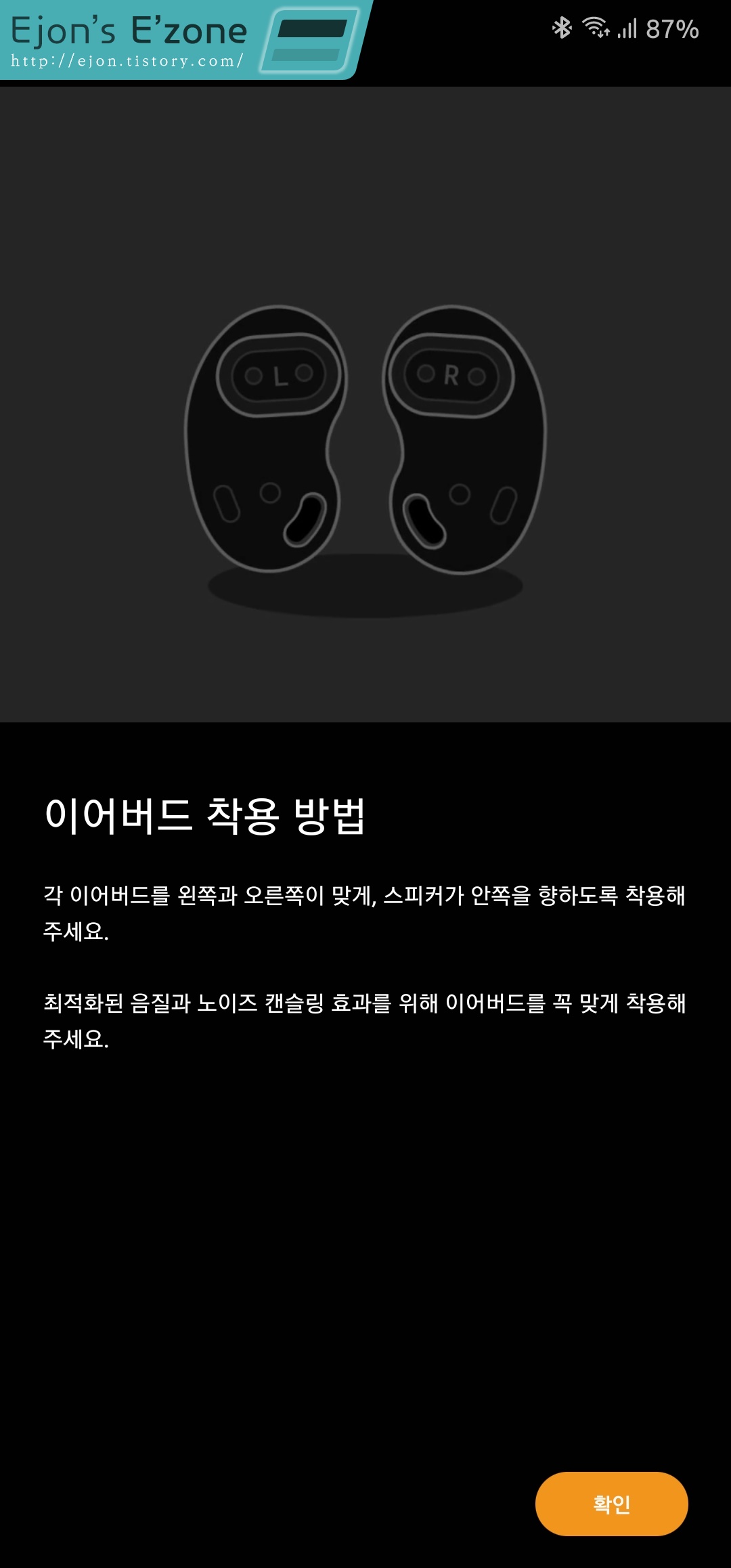 첫 연결을 한 후에는 이어버드 착용방법을 안내해줍니다. 그런데 다들 삼성이 추천하는 착용 방법대로 착용하면 불편하다거나 음악을 제대로 감상하기 어렵다고들 말씀을 하십니다. 저도 같은 생각입니다. 삼성이 원하는 방법대로 끼면 정말 깡통소리가 나거든요. 못들어 줄 정도입니다. 하지만 귀가 아플 정도만 아닐 정도로 최대한 끼워넣으면 음질이 정말 괜찮습니다. 음질, 정확히는 음색에 대해서는 글 하단에서 자세히 소개하도록 하겠습니다.