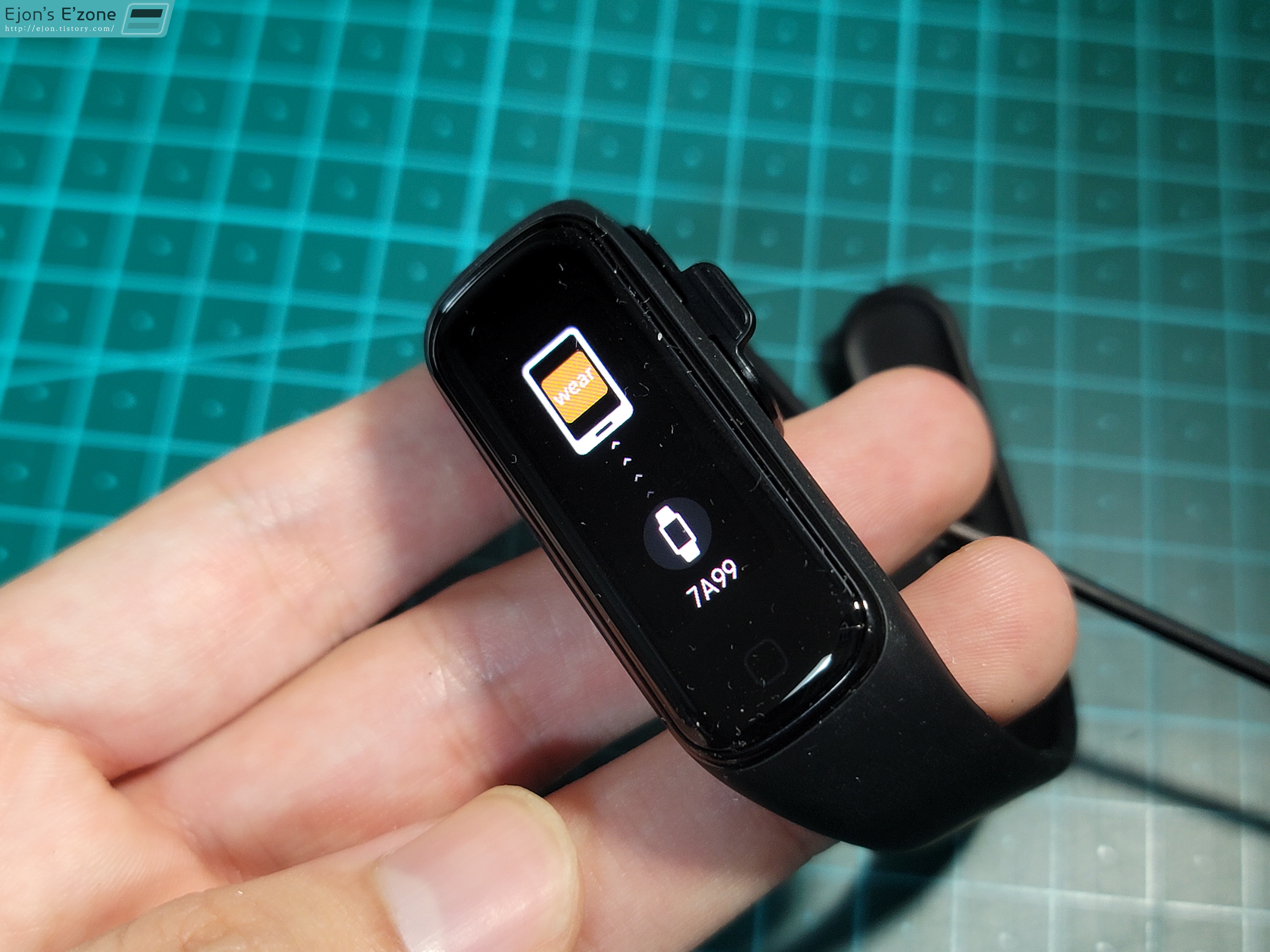 충전기는 갤럭시핏2 측면에 있는 홈에다가 끼우는 방식으로 결합됩니다. 그래서 줄을 벗길 필요는 없습니다. 하지만 인류에게는 자석이라는 좋은 물질이 있는데 굳이 물리적으로 끼우는 방식을 선택한 것은 아쉽습니다. 만약 충전기의 고정하는 부분이 부러진다면 충전할 수 없는 상태가 될 텐데요..