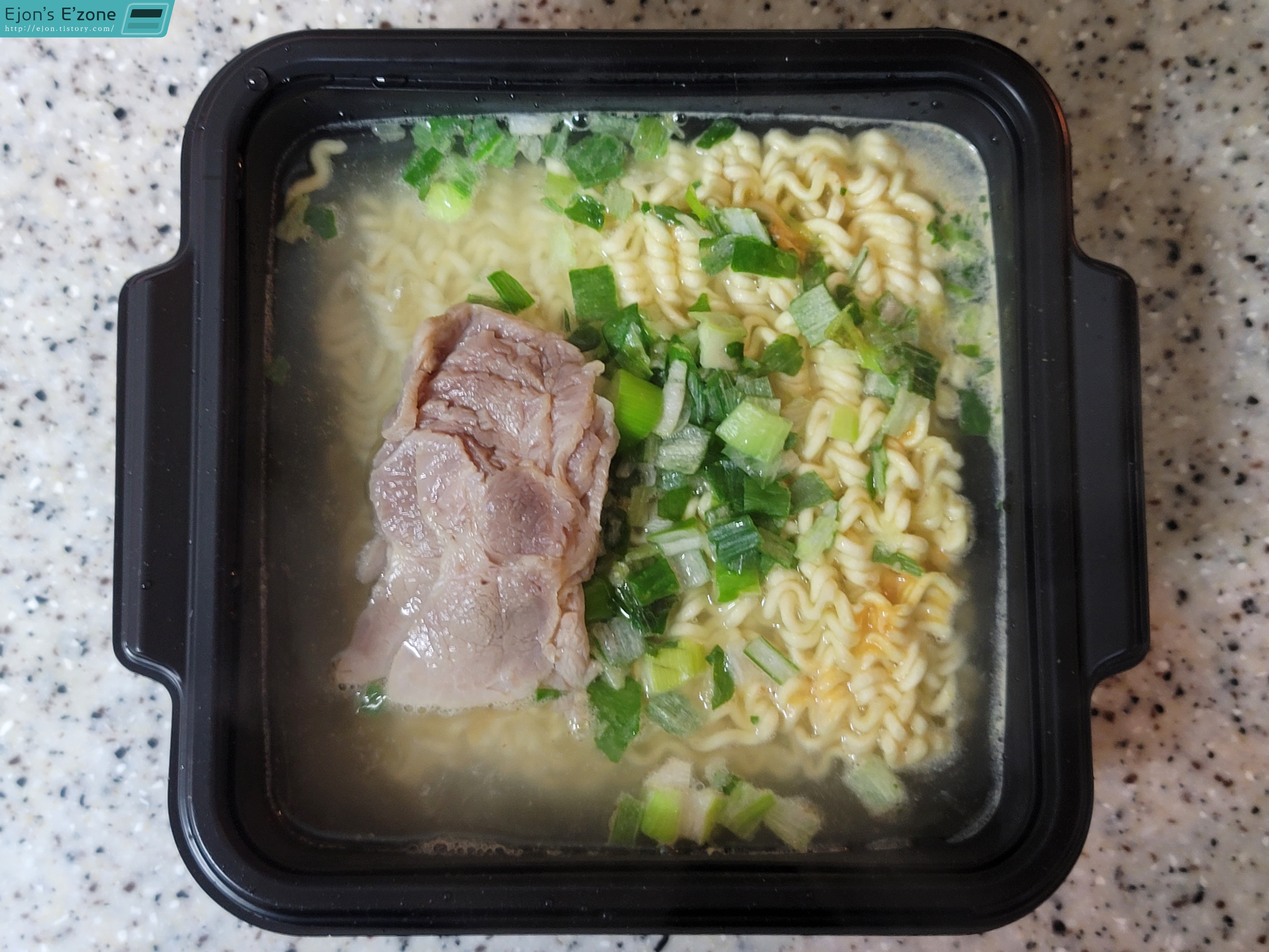 맛은 꽤 얼큰합니다.(다대기 100%) 그렇다해도 보통의 매운 라면보다 맵지는 않습니다. 진라면 매운맛보다 덜 매워요. 채소향미유가 느낌을 좀 더 새롭게 살려주고요. 돼지고기가 꽤 양이 많아서 만족스럽습니다. 보통 국밥집에 들어있는 고기 양보다 쪼금 작긴 하지만 그래도 꽤 들어가있는 편입니다. 구수하기도 하고, 조금 느끼합니다. 기름기가 좀 많아요. 물론 라면도 잘 어울리긴 하지만, 밥이 자연스럽게 생각나는 맛이었습니다. 꽤 괜찮았어요.