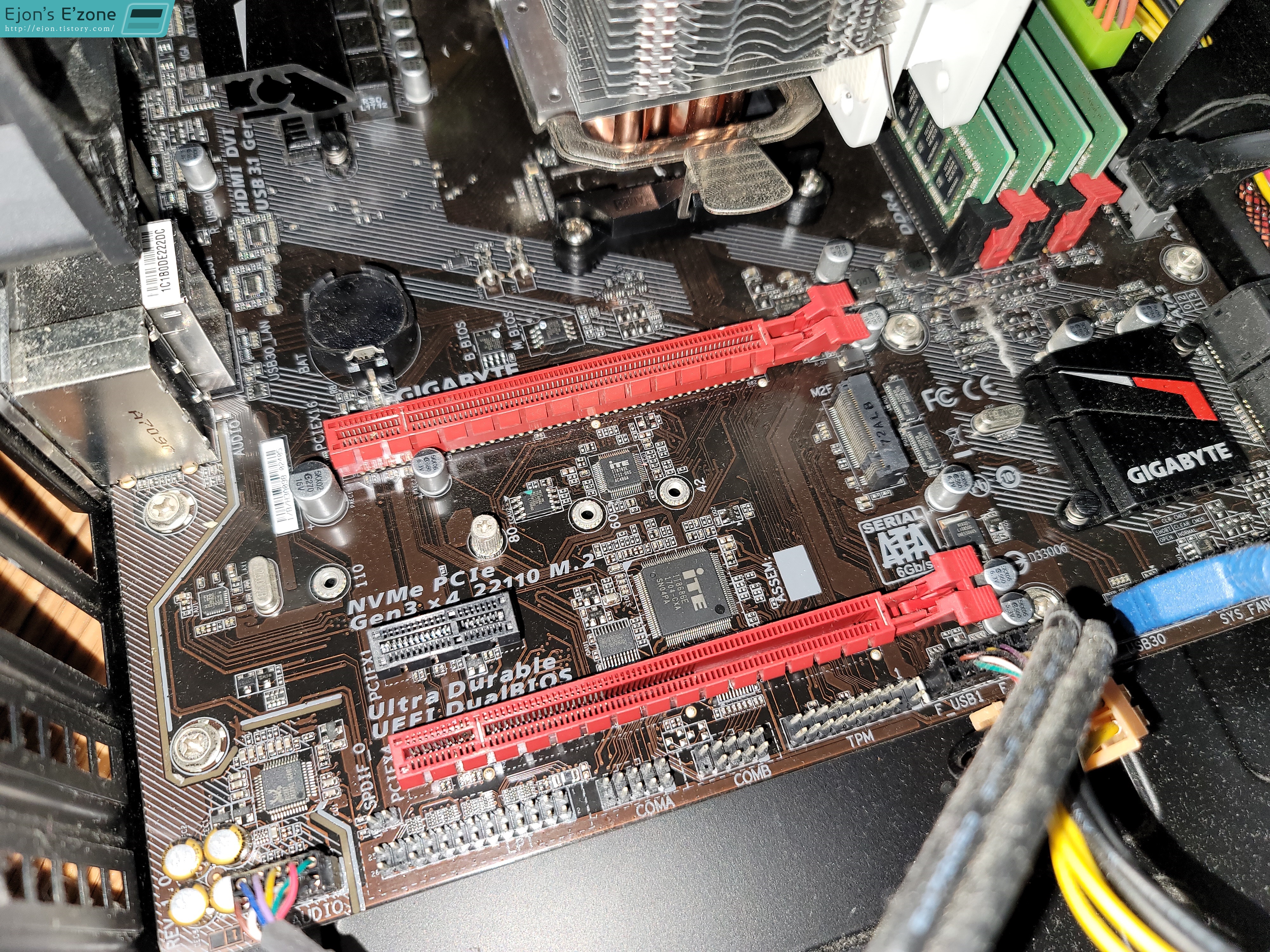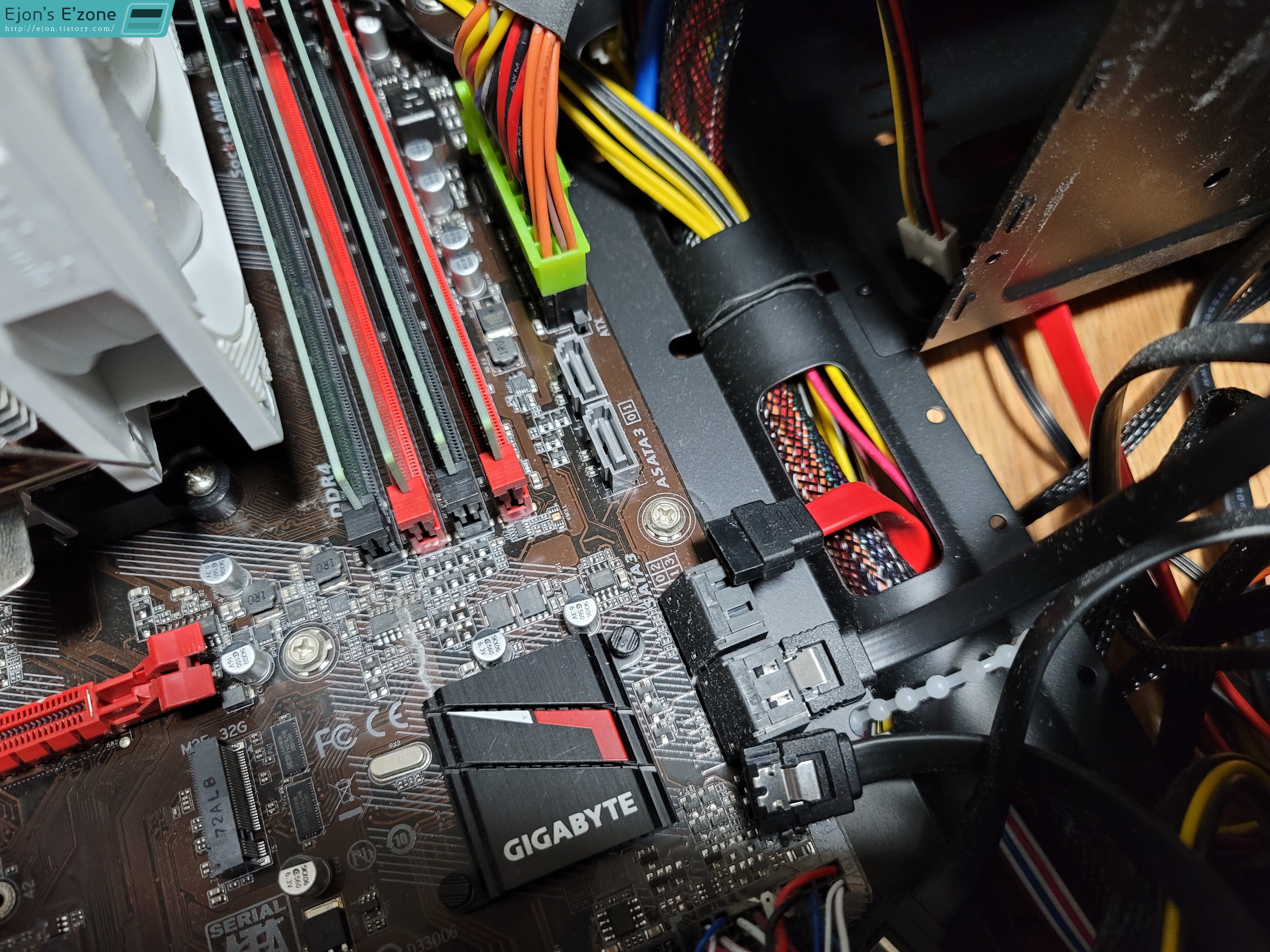 이후 힘을 줘서 꽉 끼우고, 나사를 이용해 고정해주면 장착이 끝납니다. M.2에는 별도의 SATA 케이블과 전원 케이블을 연결하지 않아도 된다는 점에서 장착은 기존의 SATA SSD보다 더 편리한 것 같습니다. 보기에도 더 깔끔하구요.