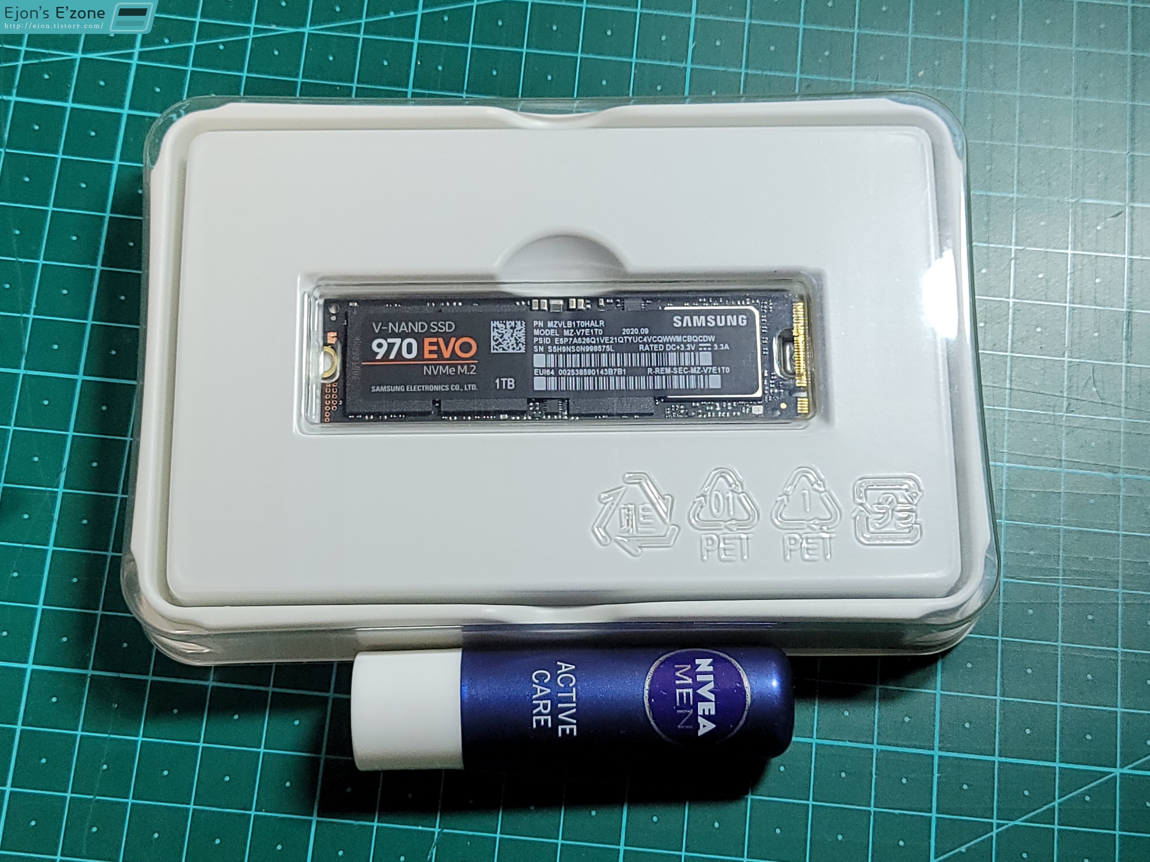 970 evo는 Nvme SSD로, m.2로만 나오게 되었어요. 그래서 860 이전 SATA SSD에 비해 크기가 많이 줄었습니다. 딱 니*아 립밤 비슷한 크기입니다.