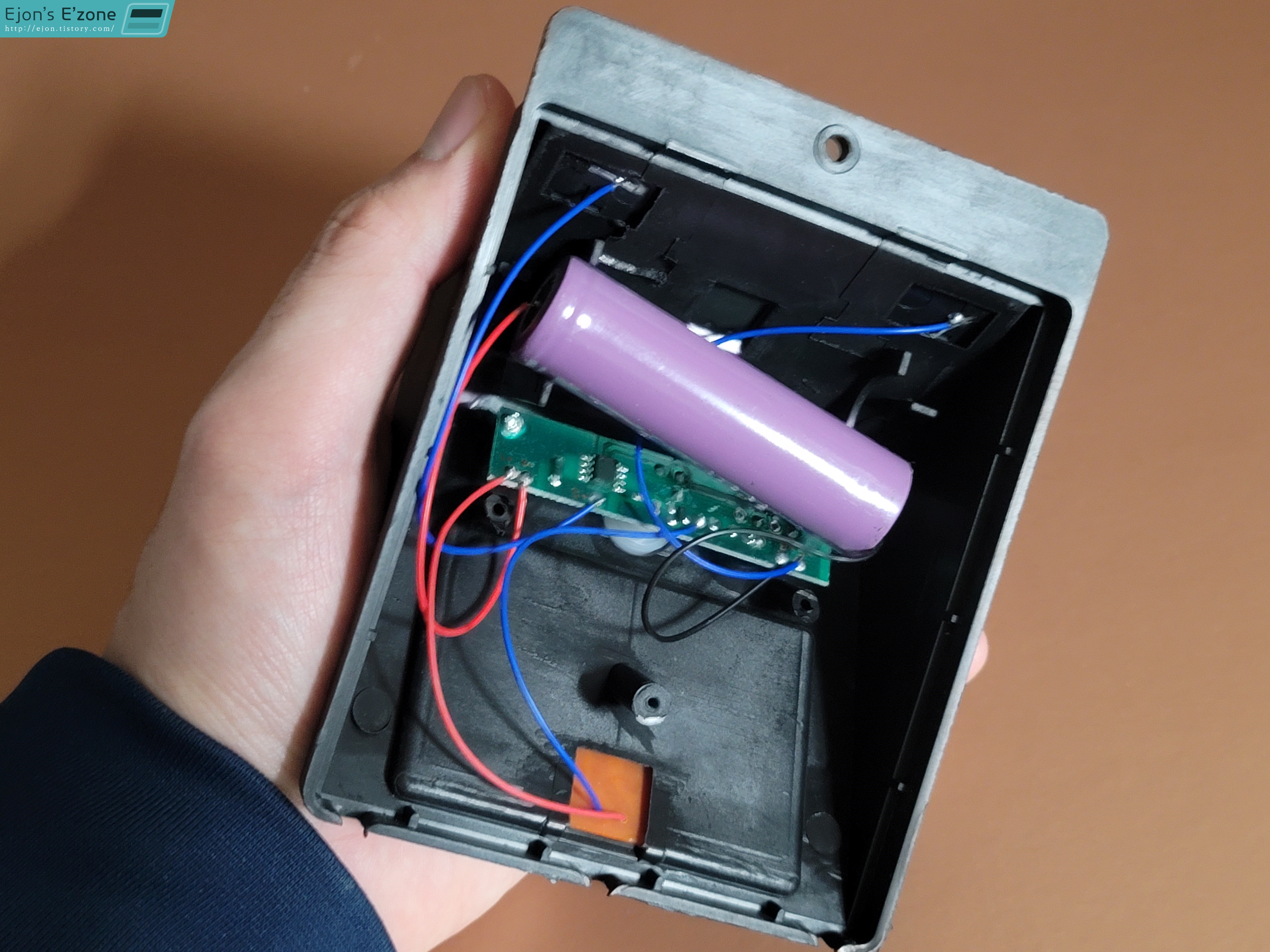 원래는 이렇게 배터리가 고정되어 있어야 하는데말이죠. 근데 애초에 이 정도로 얇은 플라스틱으로 배터리를 고정하려 한 것 자체가 잘못되지 않았나 싶습니다. 좀 더 두껍게 플라스틱을 만들어서 고정을 했어야 했을 텐데 말이죠. 이건 그냥 제가 글루건으로 고정시켰습니다.