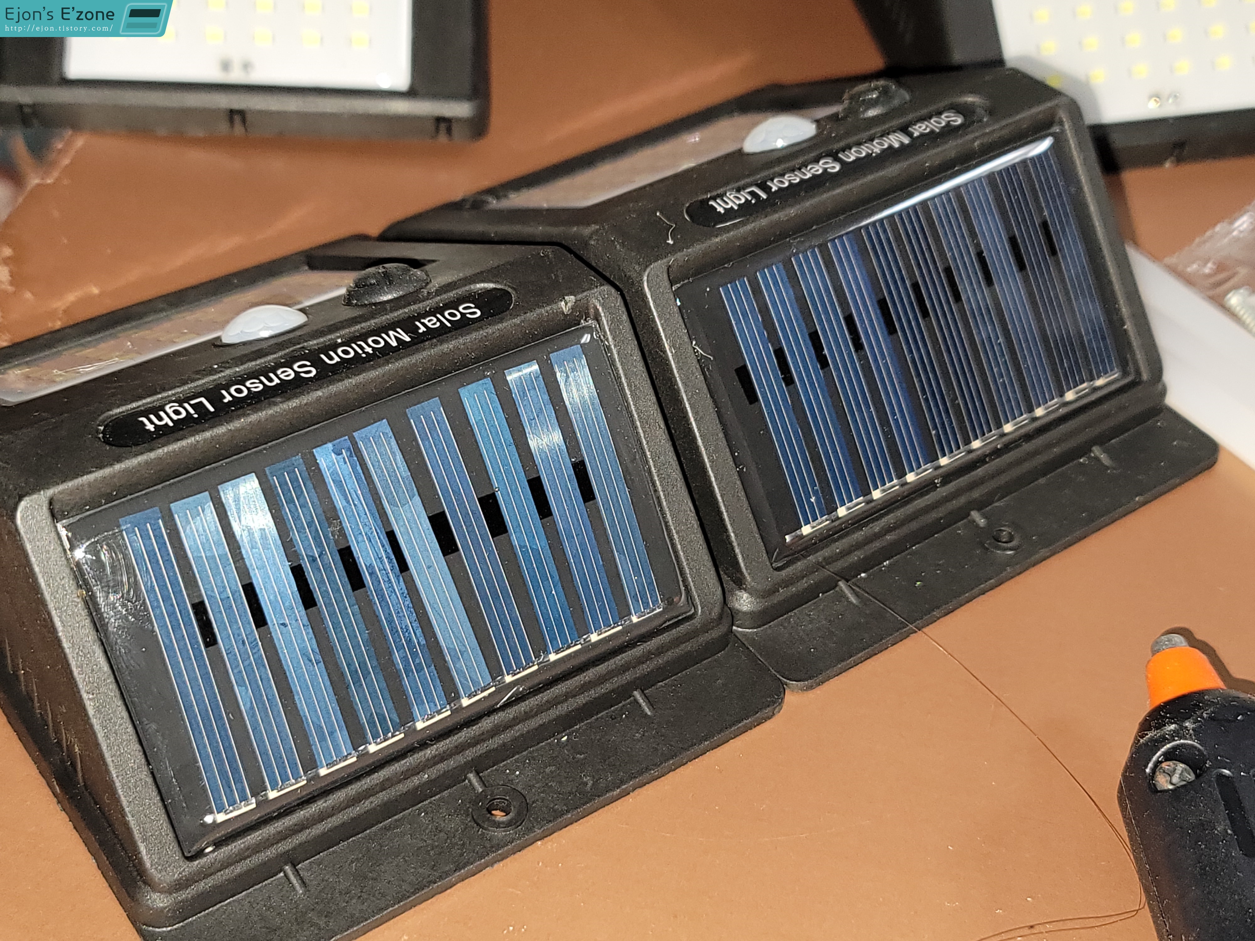 제 관점이 삐뚤어서일까요? 아니죠. 보시다시피 왼쪽 제품은 태양광 패널이 매우 삐뚤하게 박혀있는 모습을 볼 수 있지요. 근데 오히려 이 정도는 양반입니다.