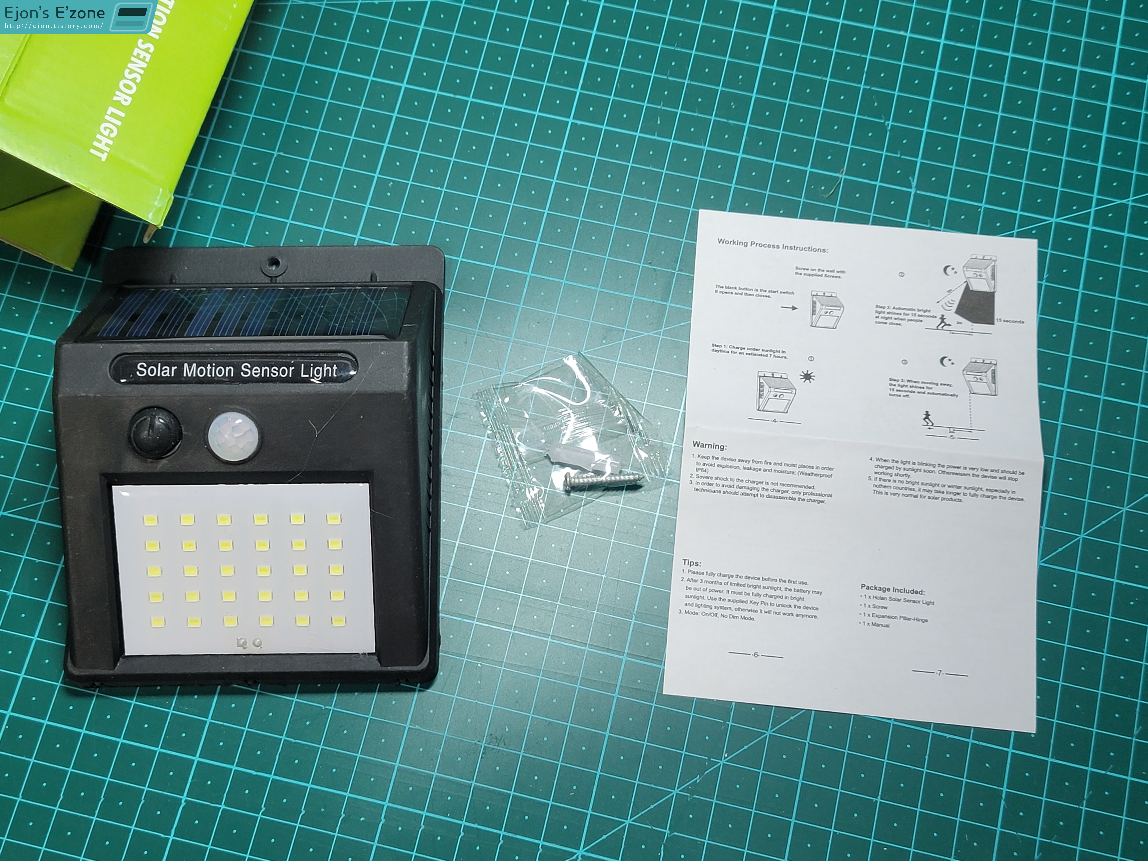 구성품은 태양광 LED 센서등 본체, 그리고 나사, 그리고 사용설명서입니다.