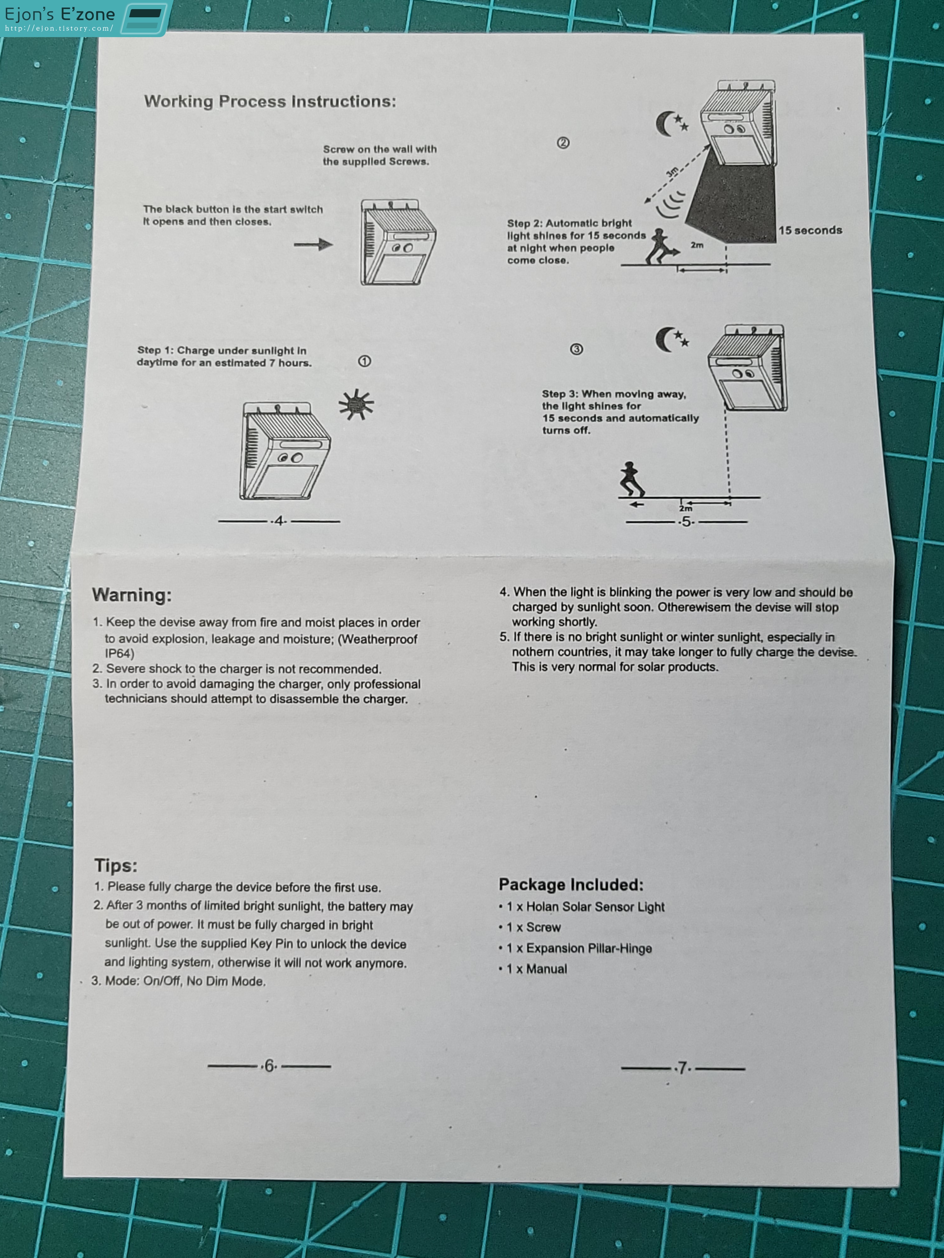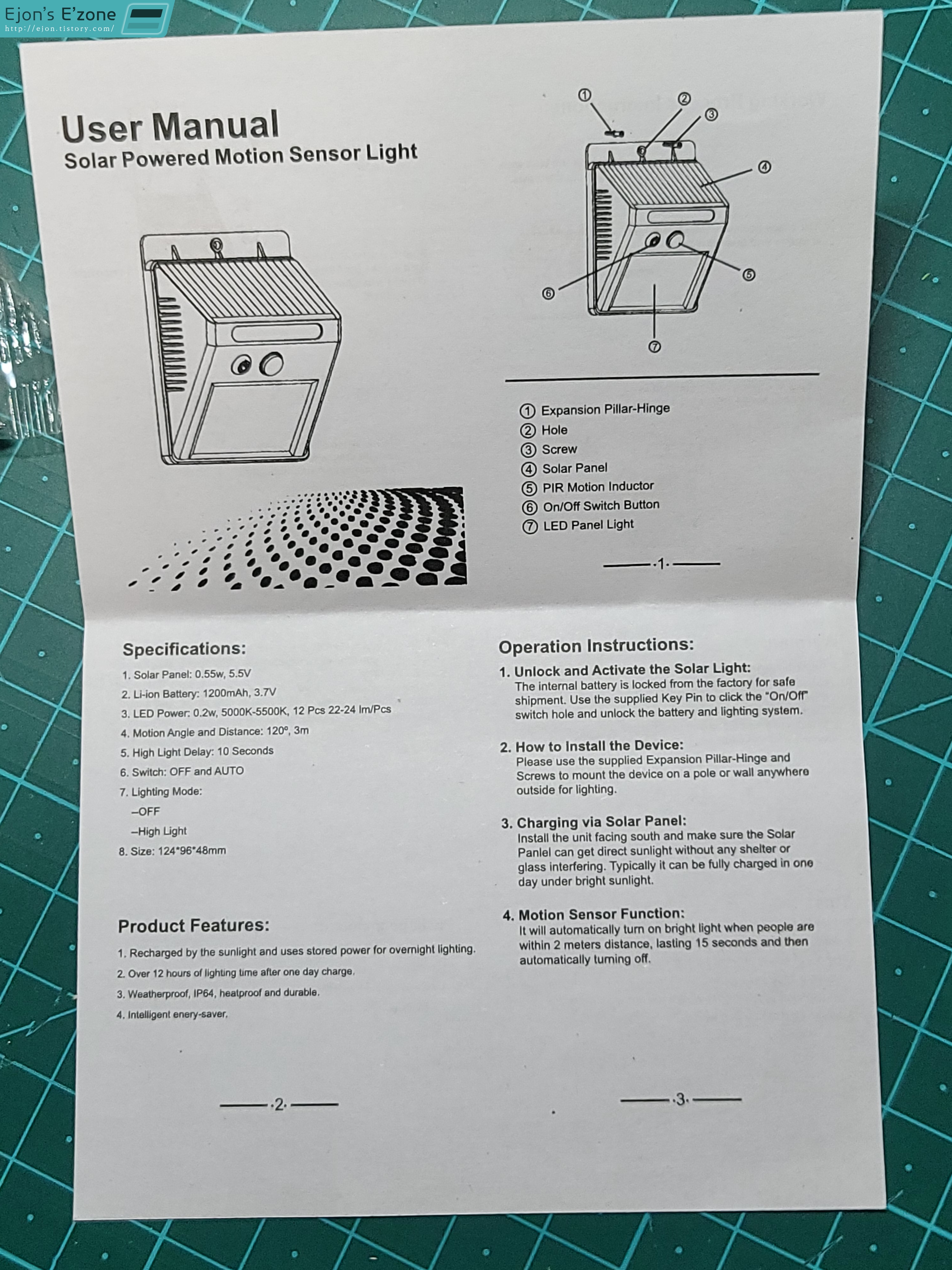 원리는 간단합니다. 낮에는 태양광 패널로 배터리를 충전하고, 태양광 패널이 밤을 감지하면, 그 때부터 사람이든 뭐든 센서에 움직이는 것이 인식되면 자동으로 등이 켜지는 겁니다. 센서 옆에 있는 전원 버튼은 정말 말 그대로 켜고 끄는 전원 버튼입니다.