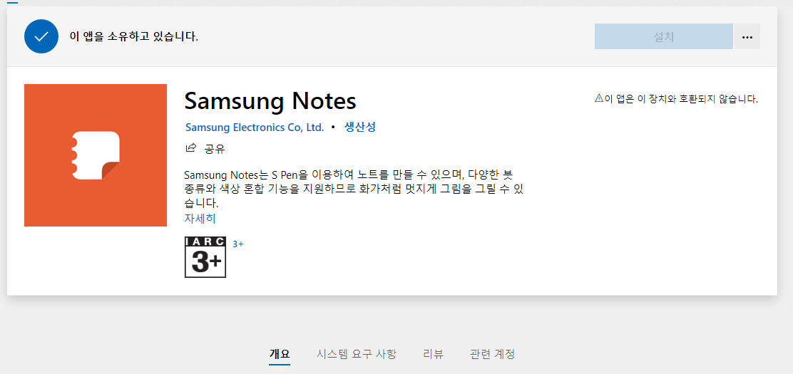 여기서 꼭 영어로 samsung notes 라고 쳐 주셔야 검색이 가능합니다. 그냥 한글로 삼성 노트를 치면 이상한 프로그램만 나옵니다. 이렇게 나오면 다운받기만 하면 될 것 같죠?