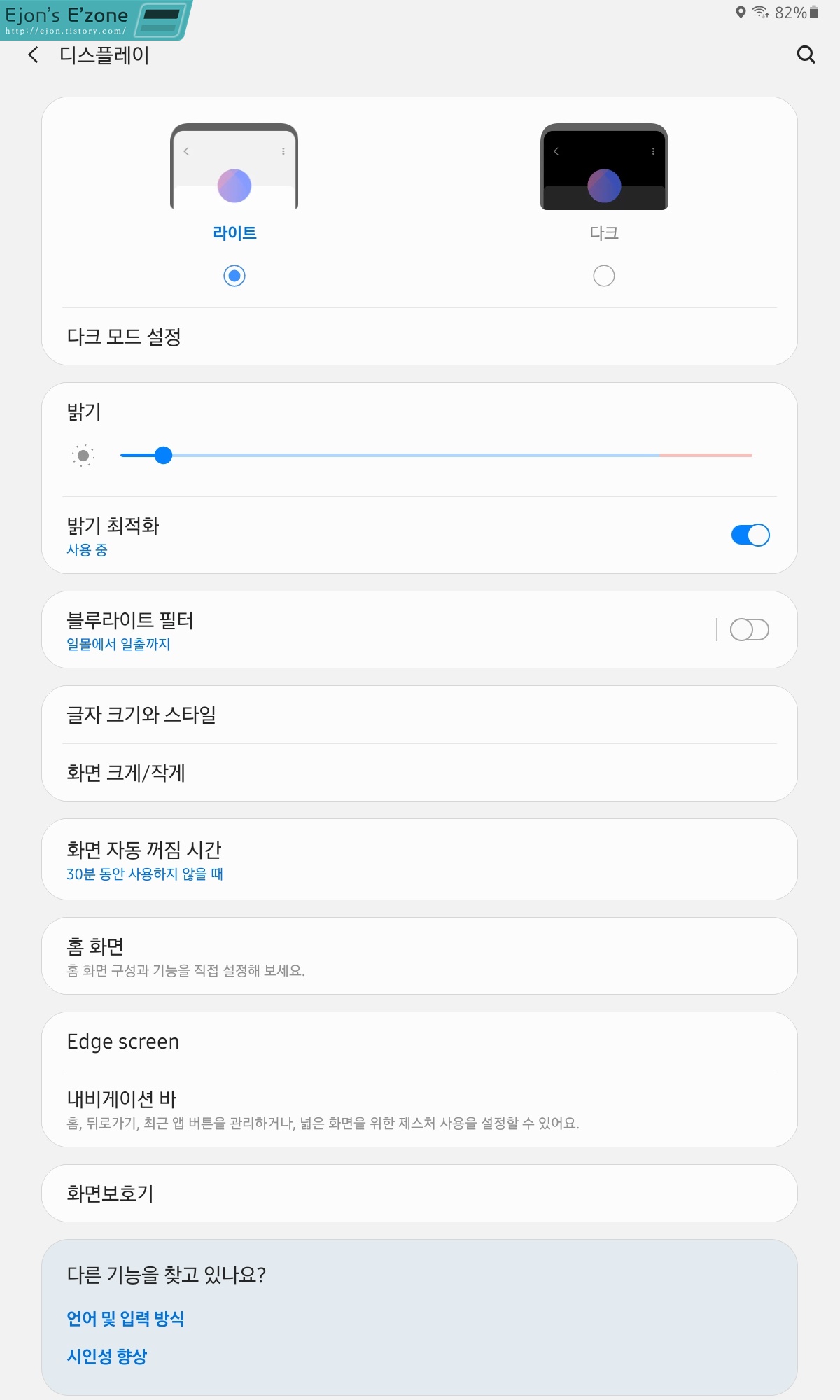 디스플레이와 관련된 설정은 이렇습니다. 다크 모드도 지원하는데요. 어차피 이 제품은 LCD를 사용하고 있기 때문에 번인을 걱정할 필요도 없고, 검은 화면을 띄운다고 해서 배터리 소모가 줄어드는 것도 아니기 때문에 저는 라이트 모드로 사용하고 있습니다.
